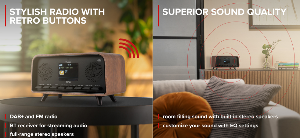 - Ψηφιακός Δέκτης DAB+ & FM: Απολαύστε πεντακάθαρο ήχο χωρίς παρεμβολές μέσω των ψηφιακών σταθμών DAB+ ή συντονιστείτε στους αγαπημένους σας αναλογικούς σταθμούς FM. Διαθέτει μνήμη για 50 προεπιλεγμένους σταθμούς, ώστε να βρίσκετε πάντα αυτό που θέλετε με ένα κλικ.