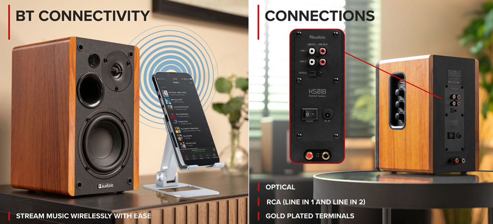 AUDIZIO KS01 WOOD Ενεργό σετ ηχείων Βιβλιοθήκης 80 Watt, Bluetooth, IRC (ζεύγος) 100.395. Ηχεία βιβλιοθήκης Audizio KS01, ιδανική επιλογή για όποιον θέλει να συνδυάσει στυλ και ήχο. Με συνολική ισχύ εξόδου 80 Watt και απόκριση συχνότητας 45 Hz έως 20kHz, αυτά τα HiFi ηχεία προσφέρουν έναν πλήρη και ισορροπημένο ήχο. Κατάλληλα να τα τοποθετήσετε στο γραφείο, studio, σαλόνι, υπνοδωμάτιο ή και την κουζίνα σας ώστε να απολαύσετε έναν ευχάριστο ήχο με μουσική, podcast ή ραδιόφωνο. Χάρη στο ξύλινο φινίρισμα και τα αφαιρούμενα μπροστινά πάνελ, τα ηχεία βιβλιοθήκης KS01 προσθέτουν μια πινελιά κομψότητας στον εσωτερικό σας χώρο. Έχουν μια ζεστή ξύλινη εμφάνιση με μαύρο μπροστινό πάνελ, που τα καθιστά πραγματικά εντυπωσιακά τόσο σε μοντέρνο όσο και σε κλασικό στυλ