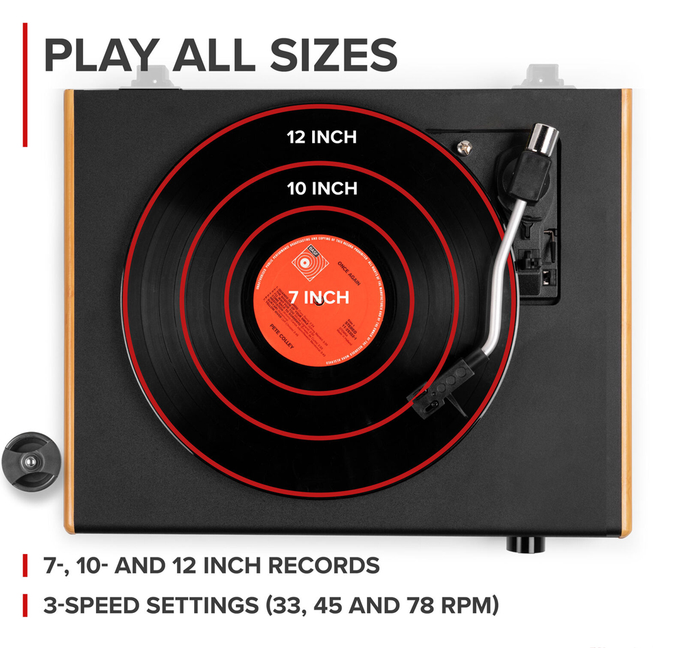- 3-speeds for 33 1/3, 45 and 78 RPM records, incl. adapter