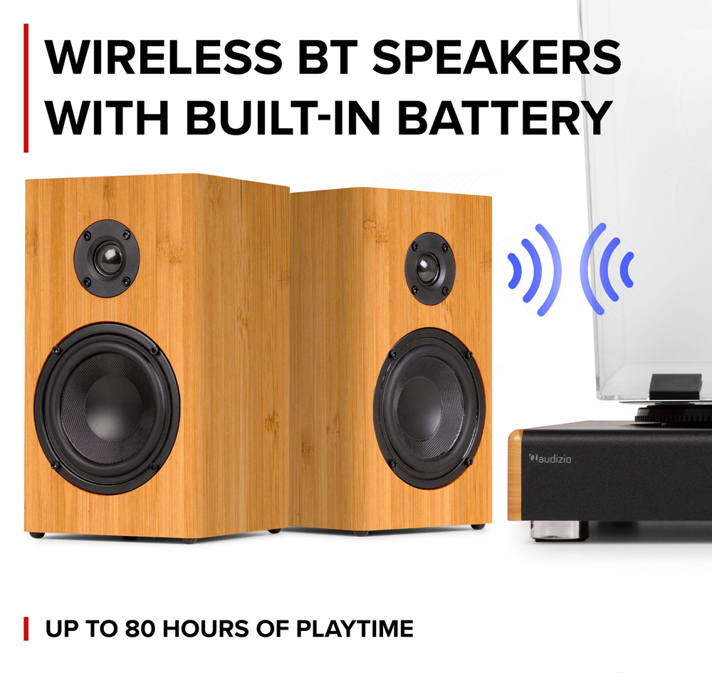 - With 2 wireless BT speakers with built-in battery (up to 80 hours of playtime)