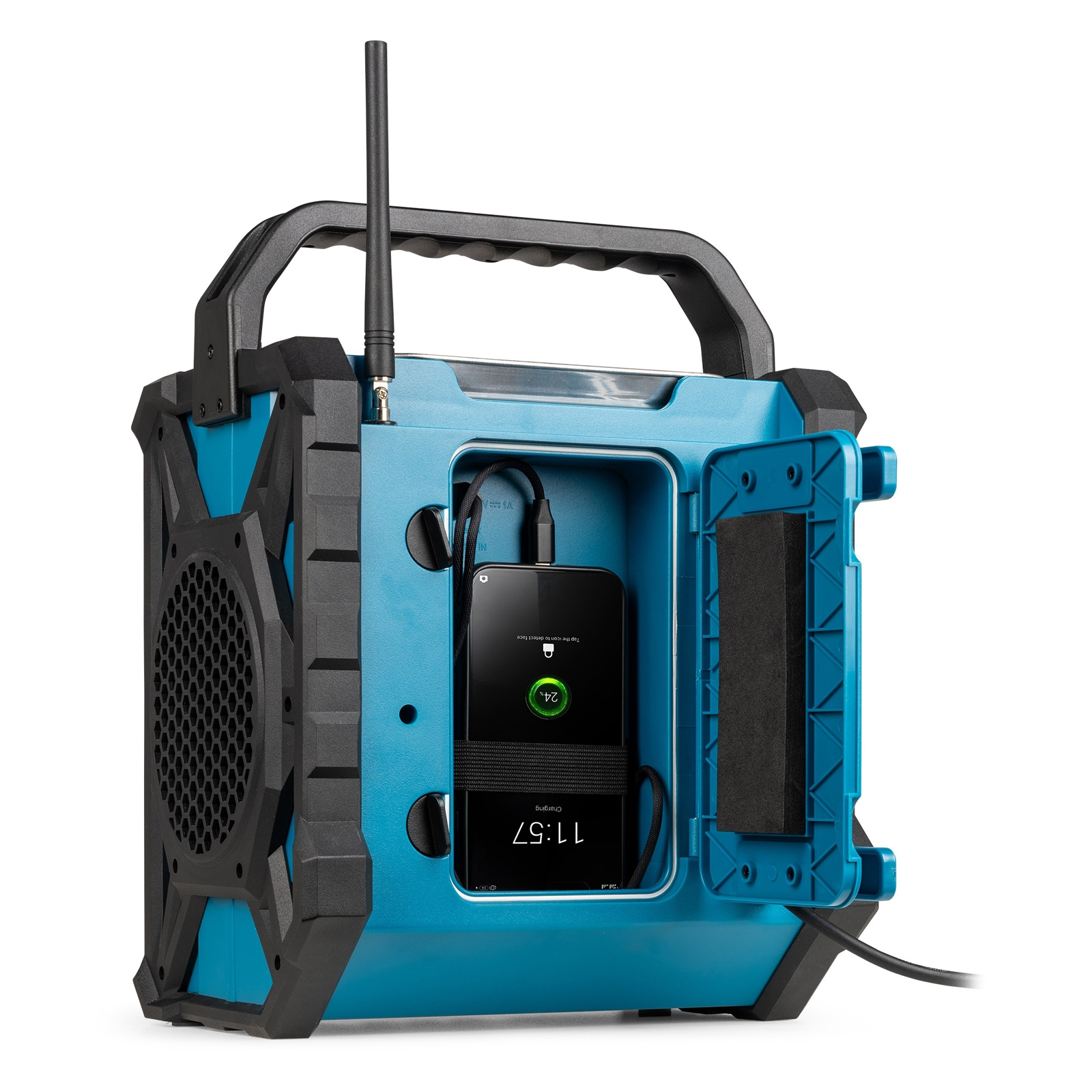 Η μπαταρία του είναι τόσο ισχυρή που μπορείτε να τη χρησιμοποιήσετε και ως power bank, επιτρέποντάς σας να φορτίζετε το τηλέφωνό σας ενώ εργάζεστε. Υπάρχει μια εύχρηστη θήκη στο πίσω μέρος του ραδιοφώνου για την ασφαλή αποθήκευση και φόρτιση του τηλεφώνου σας.