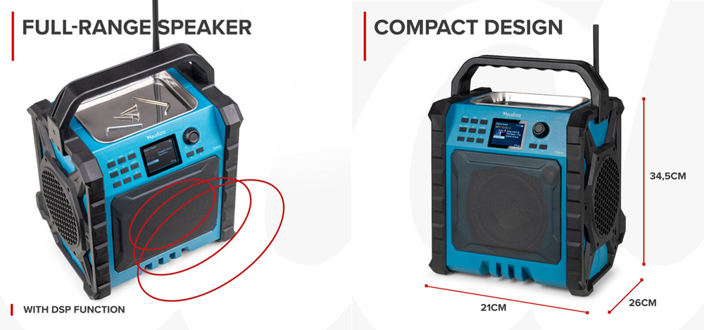 Το Audizio Jobsite TEMI-XL είναι κατασκευασμένο για να ανταπεξέρχεται στις αντίξοες συνθήκες εργασίας ακόμα και ενός εργοταξίου. Το στιβαρό του περίβλημα είναι ανθεκτικό σε κραδασμούς και κρούσεις, καθιστώντας το ιδανικό για εντατικές εργασίες. Διαθέτει μαγνητικό δίσκο στο πάνω μέρος για εύκολη αποθήκευση βιδών, μπουλονιών ή μικρών εργαλείων. Η πρακτική του λαβή, κάνει το ραδιόφωνο Jobsite TEMI-XL εύκολο στη μετακίνηση και με βάρος μόλις τέσσερα κιλά, μπορείτε εύκολα να το έχετε παντού και πάντα μαζί σας.