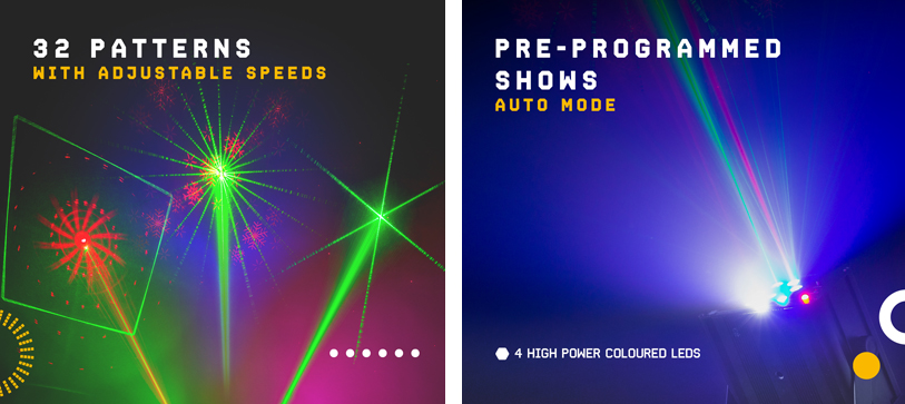 Το Acrux στηρίζεται σε 2x laser Red 100 mW και 2x laser Green 50 mW τo οποίο μπορεί να σχηματίσει και απεικονίσει μεγάλη ποικιλία σχεδίων Gobos. Εκτός από τα 4 laser, διαθέτει και άλλα 4 επιπλέον φωτεινά Led RGBW, που μπορούν να φωτίσουν Κόκκινο, Πράσινο, Μπλε και Λευκό, και συνδυαστικά το αποτέλεσμα θα σας απογειώσει. Οι δέσμες των laser δημιουργούν εντυπωσιακά κινούμενα σχέδια και φιγούρες. Το Acrux μπορεί συνολικά να παρουσιάσει 32 διαφορετικά σχέδια ώστε αν έχετε πάντα ένα δυναμικό και ξεχωριστό laser show !