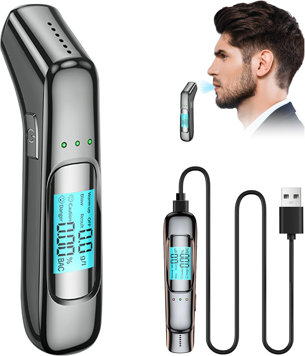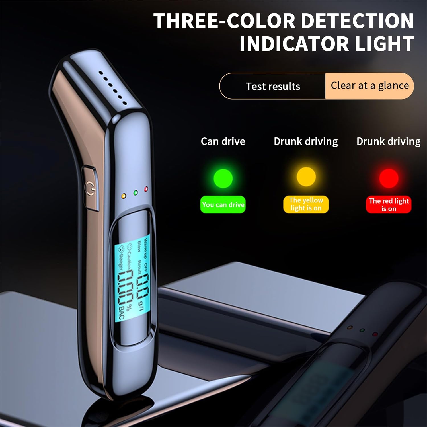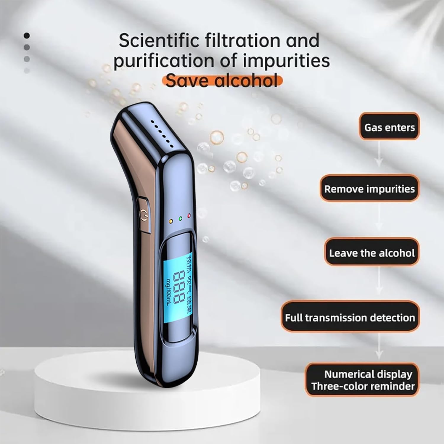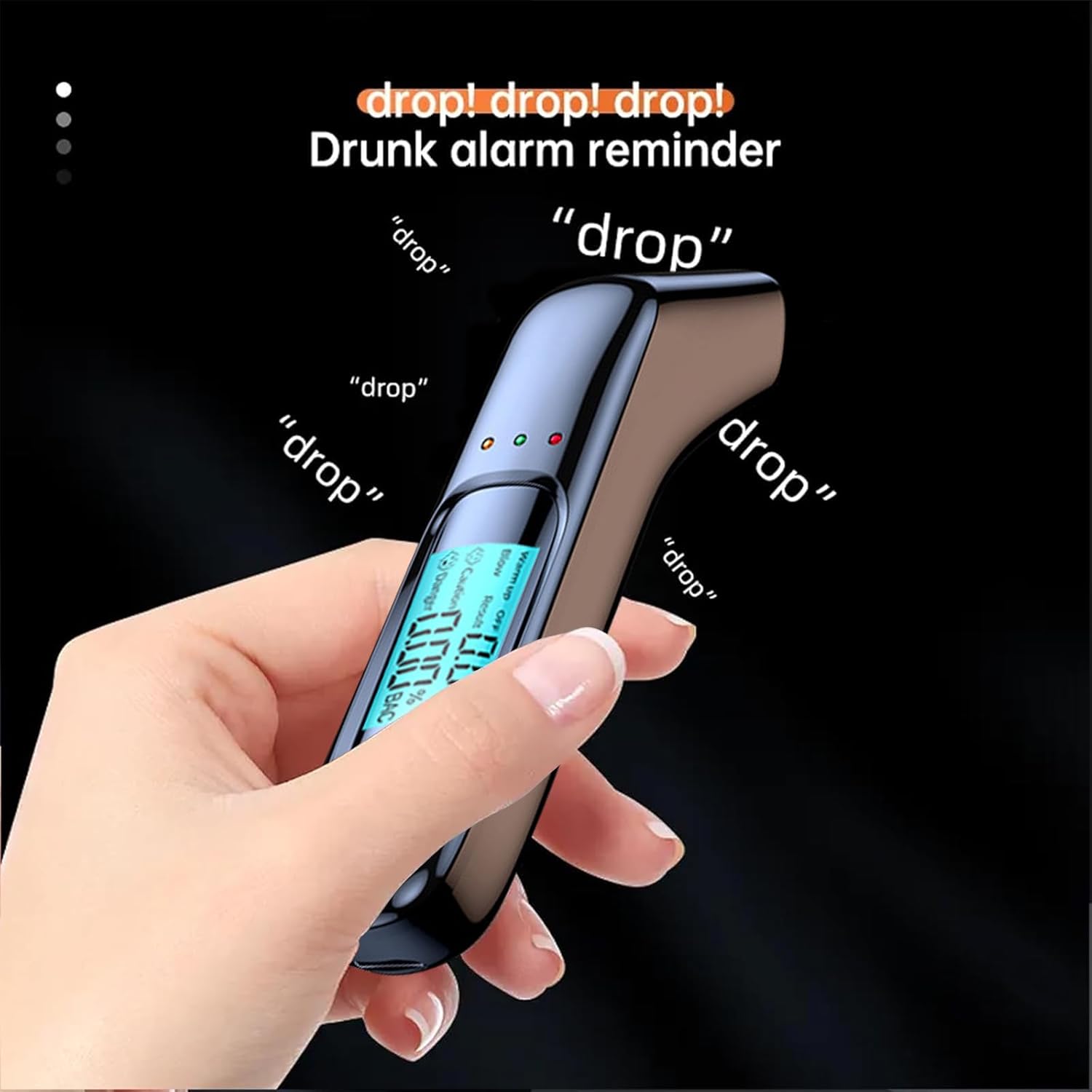 Ψηφιακή συσκευή μέτρησης αλκοόλ. Η LCD οθόνη διαθέτει δείχνει με ακρίβεια το ποσοστό αλκοόλ που εμπεριέχεται στο αίμα σας (BAC) μέσω της αναπνοής. Λειτουργεί με την οξείδωση της αιθανόλης που υπάρχει στην αναπνοή σε οξικό οξύ, μετρώντας το ηλεκτρικό ρεύμα που παράγεται κατά την διαδικασία.