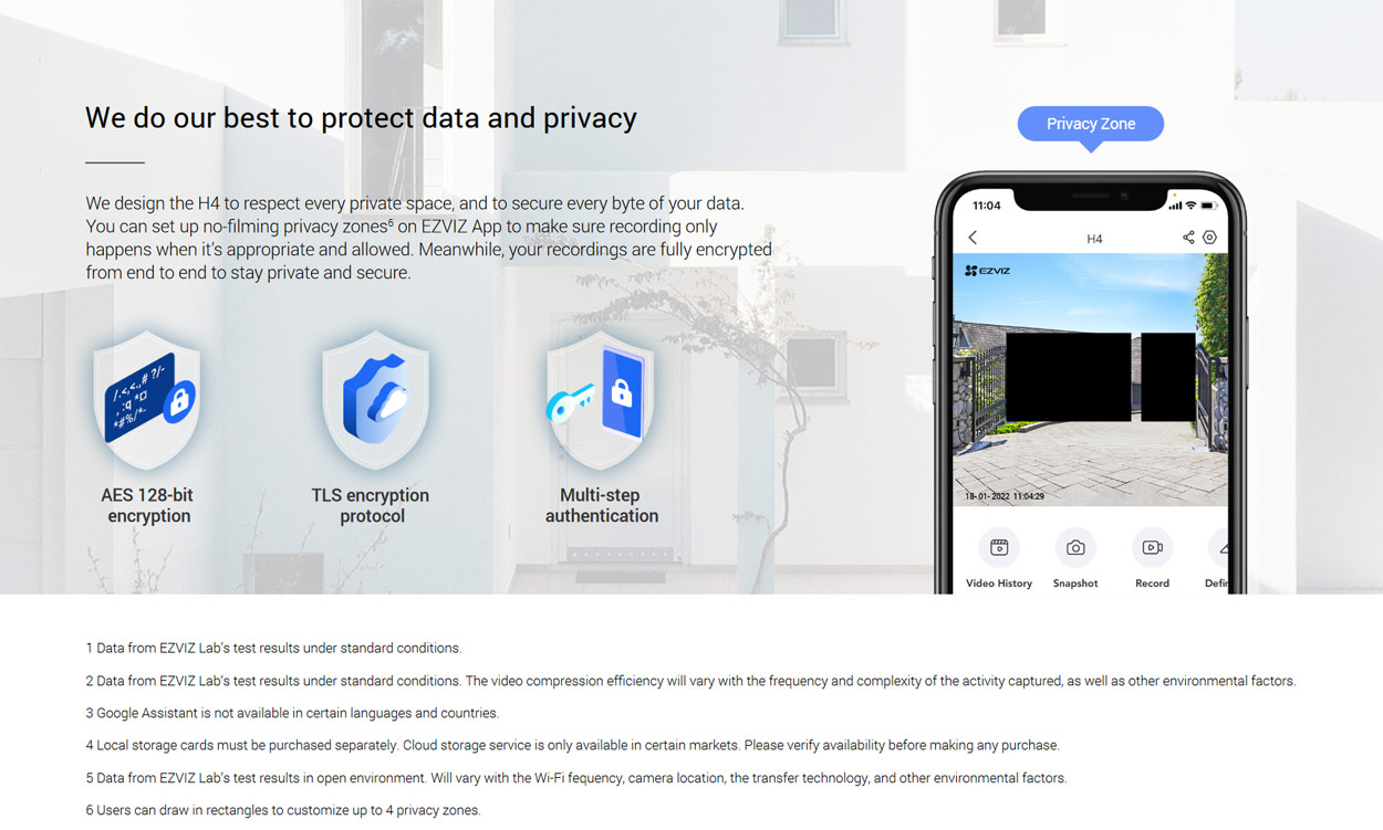 Υποστηρίζει συμπίεση Video H.265 για ταχύτερη μετάδοση στο δίκτυο και μεγαλύτερους χρόνους καταγραφής. Διαθέτει ενσωματωμένο μικρόφωνο και μεγάφωνο, προσφέροντας αμφίδρομη ηχητική επικοινωνία. Η κάμερα χρησιμοποιεί αλγορίθμους τεχνητής νοημοσύνης AI-Powered Human / Vehicle Shape Detection για αναγνώριση κίνησης από ανθρώπους ή/και αυτοκίνητα, με δυνατότητα ενεργοποίησης strobe light και αναπαραγωγής customized ηχητικών μηνυμάτων σε περίπτωση συναγερμού (ανίχνευσης κίνησης). Υποστηρίζει επίσης Alexa και Google Assistant.