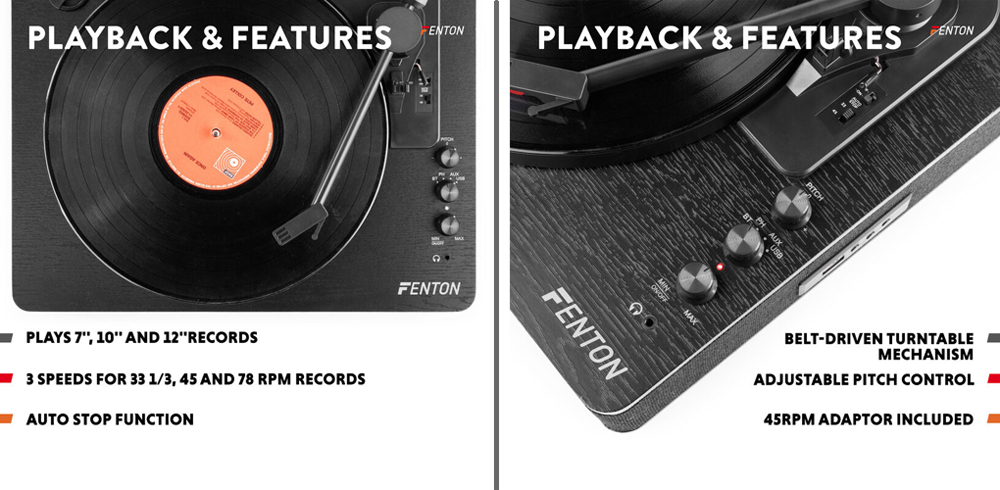 Δέχεται όλους τους τύπους βινυλίου (7", 10" και 12") και σαφώς υποστηρίζει 3 ταχύτητες αναπαραγωγής (33/ 45/ 78 στροφές), με ρυθμιστικό pitch για μικρορύθμιση στροφών. Διαθέτει μοχλό ανύψωσης βραχίονα και λειτουργία autostop , κατά την οποία στο τελείωμα του δίσκου, σταματάει αυτόματα η περιστροφή του πλατό. Εκτός από τα 2 ηχεία που διαθέτει, το οποίο το καθιστούν τελείως αυτόνομο, το πικάπ της Fenton RP162 διαθέτει Line Out για σύνδεση του σήματος σε εξωτερικό ενισχυτή, ώστε να το απολαύσετε από το ηχεία του Hi-Fi συστήματός σας. Επιπλέον για να μην ενοχλείτε τους διπλανούς σας, διαθέτει και έξοδο ακουστικών, ώστε να συνδέσετε τα ακουστικά σας και να απολαυσετε το βινυλίο σε τελείως προσωπικές στιγμές.