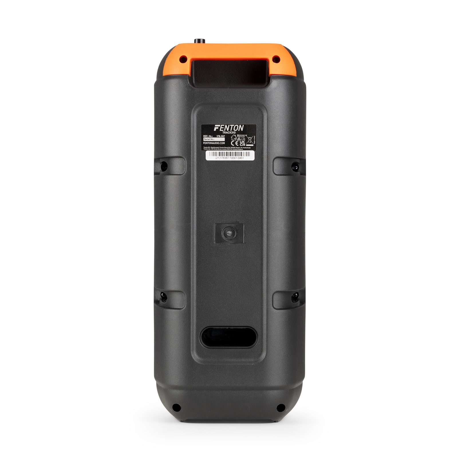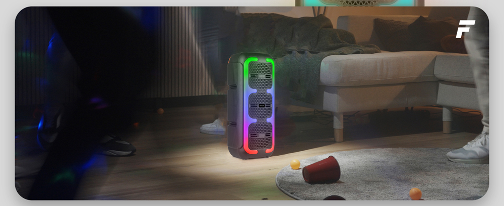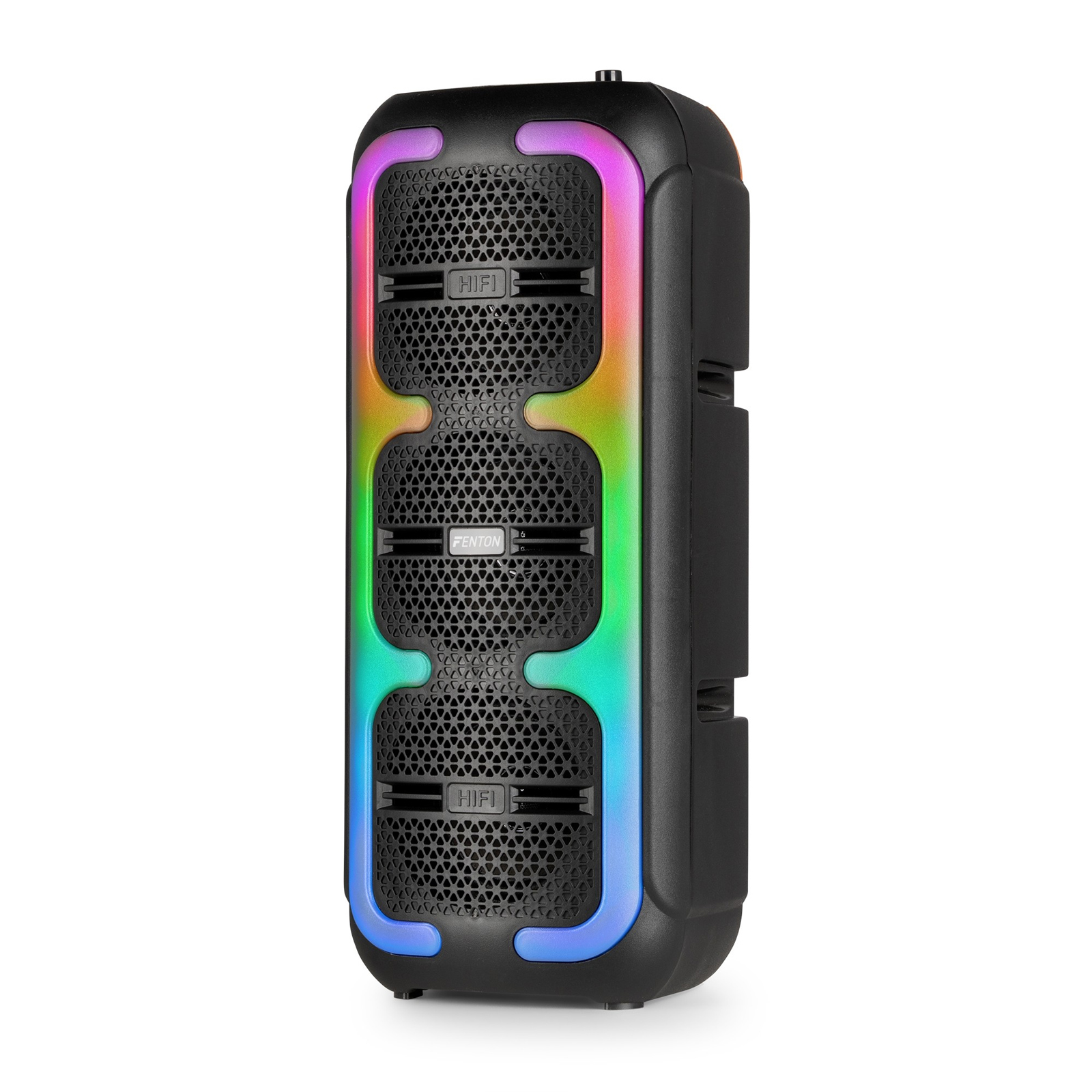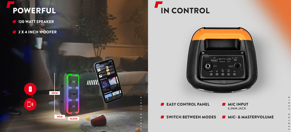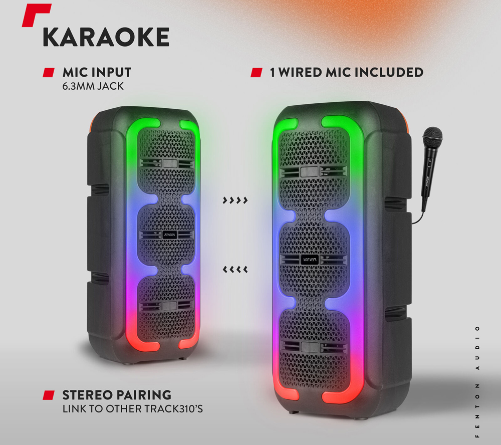 Το Fenton Track310 είναι το ιδανικό ηχείο Bluetooth για όποιον θέλει να απολαμβάνει μουσική οποτεδήποτε και οπουδήποτε. Χάρη στην ενσωματωμένη επαναφορτιζόμενη μπαταρία Lithium 3.7V - 2.4Ah, μπορείτε να ακούτε τα αγαπημένα σας κομμάτια ασταμάτητα για έως και 8 ώρες. Και όταν εξαντληθεί, φορτίζεται πλήρως ξανά σε μόλις 4 ώρες. Εκπλαγείτε από τον ήχο και την ισχύ των 120W. Μπορεί και δημιουργεί "ατμόσφαιρα" με το LED φωτισμό, το οποίο μπορείτε εύκολα να ενεργοποιήσετε ή να απενεργοποιήσετε. Με το ενσύρματο μικρόφωνο (το οποίο περιλαμβάνεται), μπορείτε να δοκιμάσετε το ταλέντο σας σε αυτοσχέδιες στιγμές καραόκε. Είναι αρκετά συμπαγές και ελαφρύ (μόνο 1.78 kg). Η στιβαρή λαβή διευκολύνει τη μεταφορά του ηχείου, ώστε να το έχετε παντού και πάντα μαζί σας