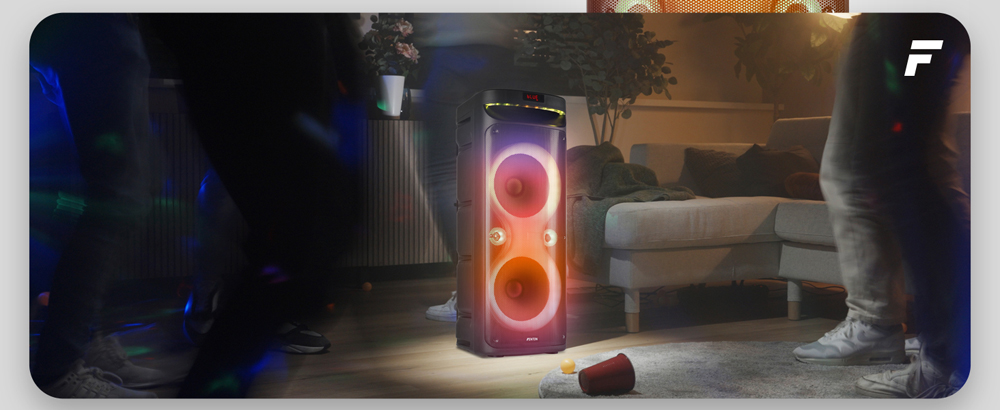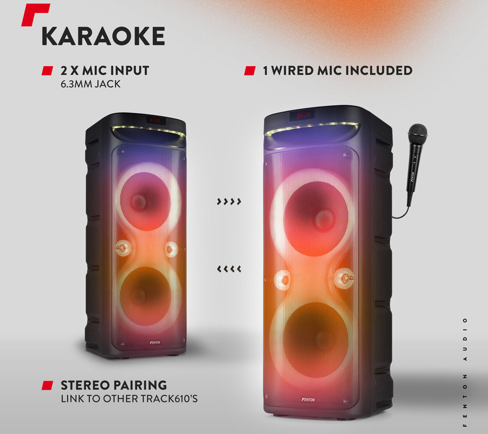 Το Fenton Track610 είναι ένα ηχείο πάρτι 240W με δύο Woofer 10" που προσφέρουν δυνατό ήχο για όλα τα πάρτι και τις περιστάσεις σας. Με τα ενσωματωμένα εφέ Led φωτισμού (που αντιδρούν στη μουσική που παίζει), το επόμενο πάρτι σας θα είναι μια τεράστια επιτυχία! Χάρη στην ενσωματωμένη επαναφορτιζόμενη μπαταρία Lithium 7.4V - 3.6Ah, μπορείτε να ακούτε τα αγαπημένα σας κομμάτια ασταμάτητα για έως και 10 ώρες, ενώ μια πλήρης φόρτιση διαρκεί μόλις 4 ώρες.