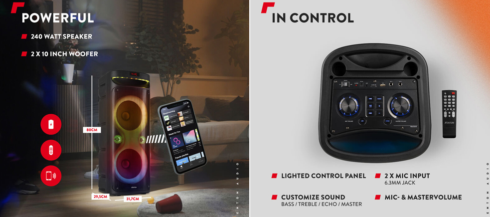 Διαθέτει Bluetooth 5.0, επιτρέποντάς σας να απολαμβάνετε μουσική από απόσταση (ανάλογα με τα εμπόδια). Μπορείτε εύκολα να το μετακινήσετε σε οποιαδήποτε επιθυμητή τοποθεσία χρησιμοποιώντας τους ενσωματωμένους τροχούς στο κάτω μέρος. Ιδανικό για πάρτι στον κήπο ή στο σπίτι. Το ηχείο διαθέτει 2x Woofer 10" και 1x Tweeter 1". Αυτός ο συνδυασμός εξασφαλίζει ισορροπημένη αναπαραγωγή υψηλών και χαμηλών συχνοτήτων. Έτσι, μπορείτε να απολαύσετε βαθιά μπάσα, με ισχύ εξόδου 240 Watt.