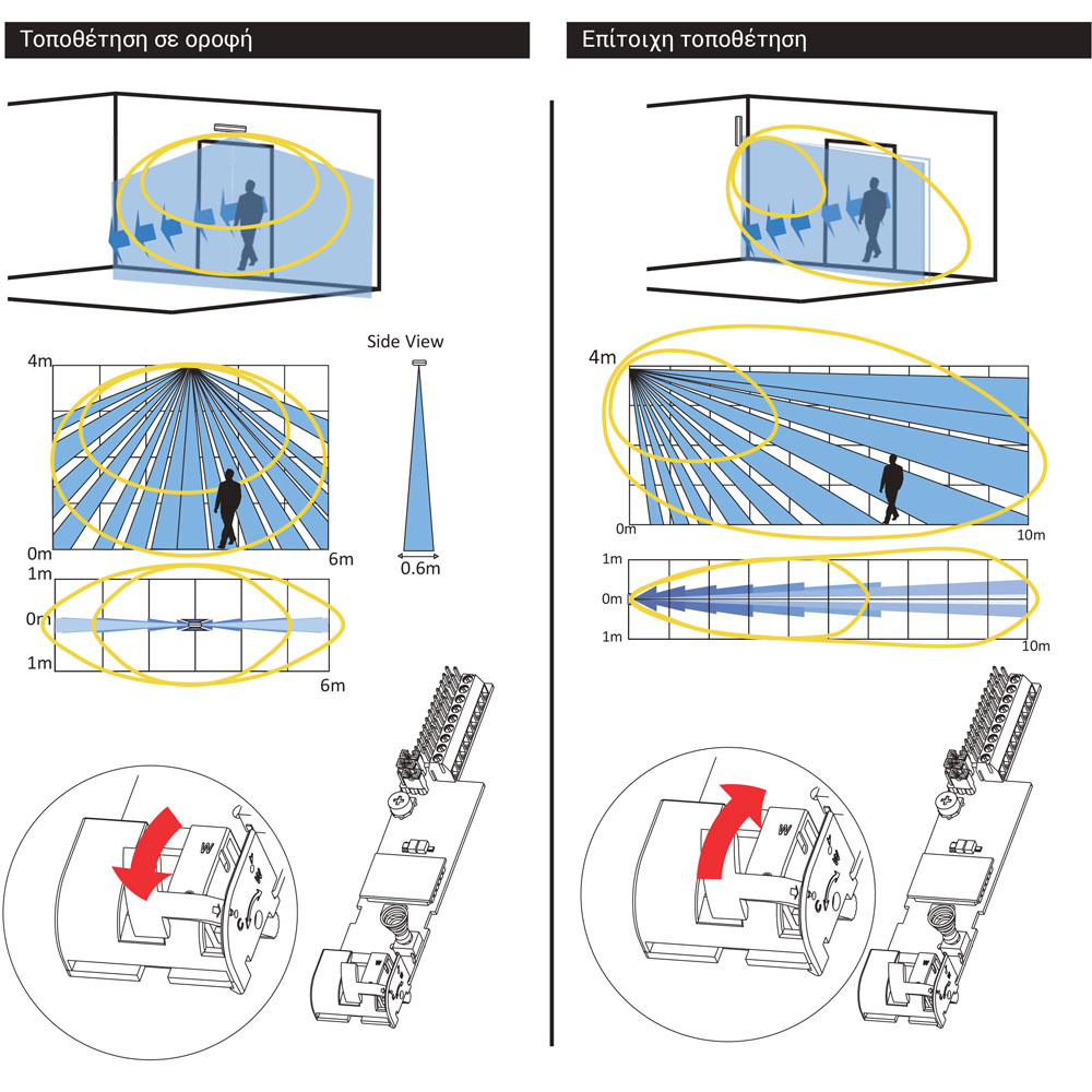 - Εμβέλεια: 10m (Wall mount) / 6m (Ceiling mount).