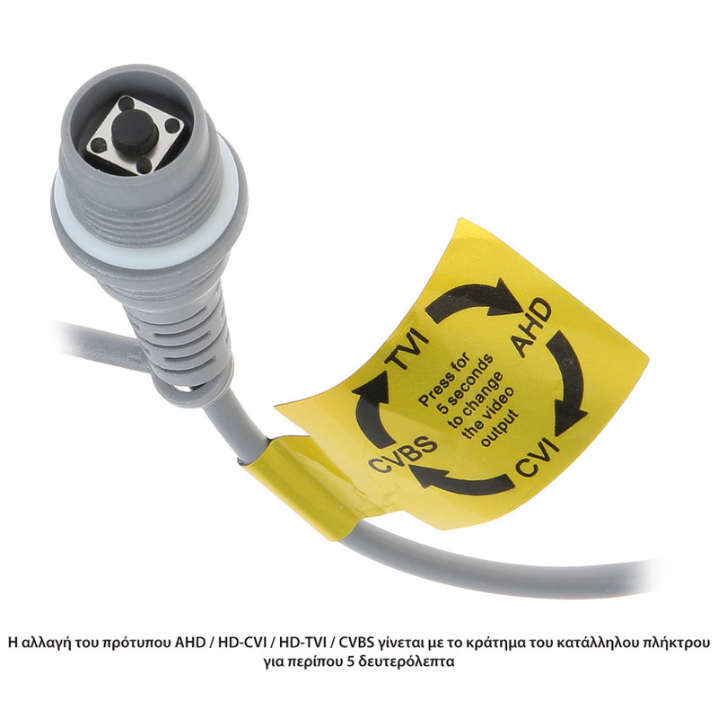 Είναι τεχνολογίας 4-σε-1, συμβατή με καταγραφικά HDTVI / HDCVI / AHD και αναλογικά CVBS με επιλεγόμενη έξοδο (η έξοδος επιλέγεται πάνω από το Button που βρίσκεται στο καλώδιο της κάμερας, με προεπιλεγμένο το HDTVI, όπως φαίνεται στις αναλυτικές φωτογραφίες του προϊόντος).