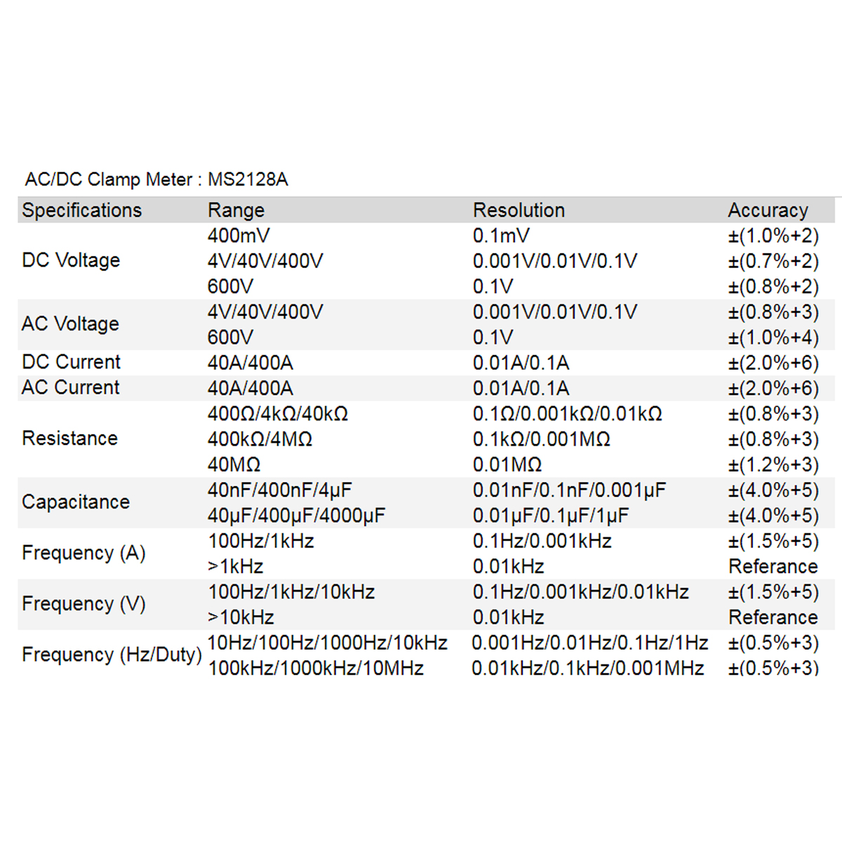 - Συχνότητα (Μέτρηση με τσιμπίδα) : 40Hz-400Hz±1.0%