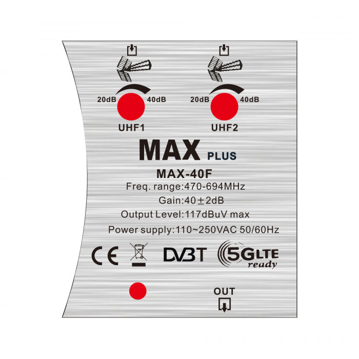 MAX PLUS, MAX-40F 2U 1x117-40 5G Ενισχυτής κεντρικής κεραίας με 2 εισόδους UHF για 2 κεραίες και 1 εξόδο με ενσωματωμένο φίλτρο LTE 5G (3G/4G/5G).