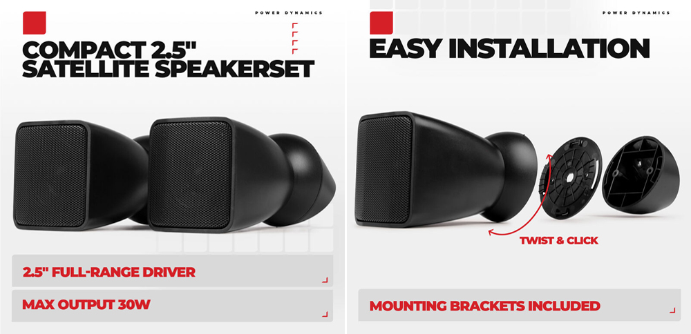 BSX30 της Power Dynamics, υψηλής ποιότητας σετ ηχείων δορυφόρων 2.5", σχεδιασμένα για διακριτική αλλά και εντυπωσιακή ενίσχυση του ήχου σε εμπορικούς και οικιακούς χώρους. Προσφέρουν ευέλικτη συμβατότητα τόσο με συστήματα γραμμής 100V όσο και με ωμικά συστήματα ήχου 8 Ohm. Compact ηχεία που προσφέρουν κρυστάλλινο ήχο σε κομψό, χαμηλού προφίλ σχεδιασμό. Το γούφερ 2.5" προσφέρει έναν εκπληκτικά γεμάτο ήχο στην περιοχή των 150Hz έως 20.000Hz.