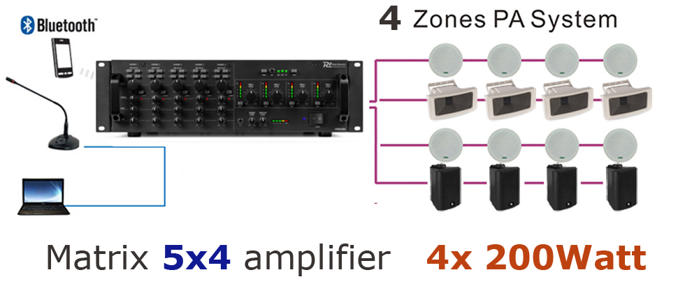 952.163 Επαγγελματικός Matrix ενισχυτής εγκατάστασης PA Mixer Public Address 5x Εισόδους και ισχύς 4x 200 Watt RMS με 4 ζώνες ρυθμιζόμενης έντασης. Ιδανική λύση για πραγματικό "Multi-room" ήχο, με διαφορετική πηγή σε κάθε χώρο.