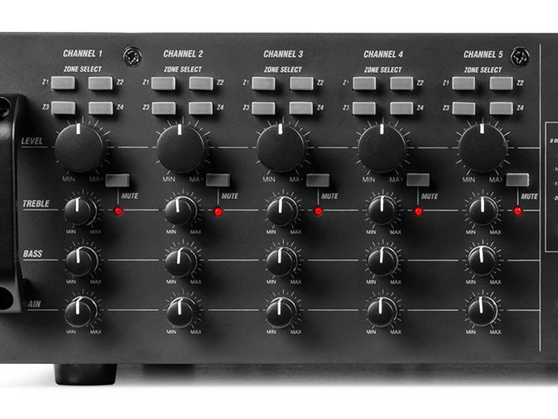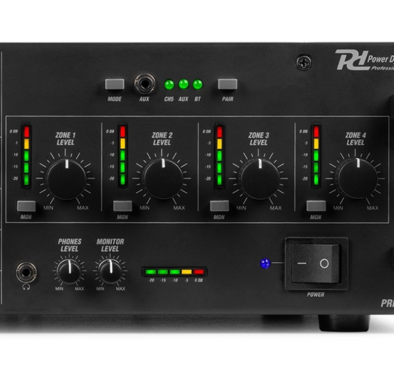 Ενισχυτής με δυνατότητα σύνδεσης ωμικών ηχείων (4, 8 Ohm) αλλά και ηχείων με μετασχηματιστή προσαρμογής (100Volt). Διαθέτει δέκτη Bluetooth για ασύρματο streaming μουσικής.