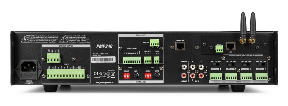 Στο πίσω μέρος βρίσκονται όλες οι επαγγελματικές συνδέσεις, ξεκινώντας αριστερά με την τροφοδοσία και τις εξόδους ηχείων (Terminal blocks) για γραμμές 100V, 70V ή 4-16 Ohm, χωρισμένες στις 6 ζώνες. Στο κέντρο δεσπόζει το τμήμα Emergency, το οποίο περιλαμβάνει επαφές Bypass, είσοδο EMC για σύνδεση με συστήματα πυρανίχνευσης και ρυθμιστικά για το Chime (ήχος προειδοποίησης) και το VOX (προτεραιότητα φωνής). Στη δεξιά πλευρά υπάρχουν οι 2 κεραίες για το WiFi και το Bluetooth, η θύρα RJ45 (Remote Mic) για τη σύνδεση του paging μικροφώνου PMPM10, καθώς και οι είσοδοι των 4 καναλιών με επιλογείς επιπέδου (Line/Phono/Mic) και Phantom Power. Τέλος, παρέχονται έξοδοι Rec Out και Link Out μέσω RCA για σύνδεση με επιπλέον ενισχυτές ή καταγραφικά.