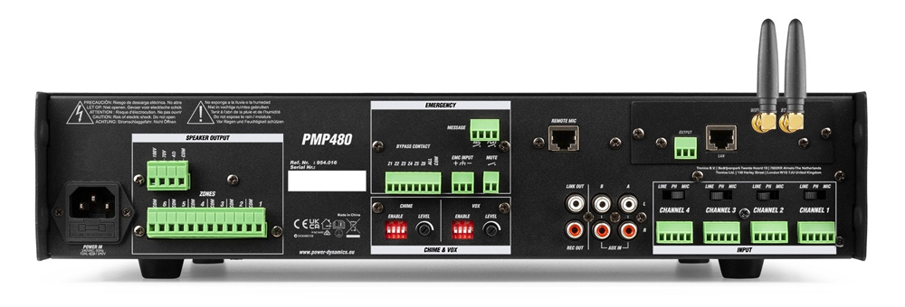Στο πίσω μέρος βρίσκονται όλες οι επαγγελματικές συνδέσεις, ξεκινώντας αριστερά με την τροφοδοσία και τις εξόδους ηχείων (Terminal blocks) για γραμμές 100V, 70V ή 4-16 Ohm, χωρισμένες στις 6 ζώνες. Στο κέντρο δεσπόζει το τμήμα Emergency, το οποίο περιλαμβάνει επαφές Bypass, είσοδο EMC για σύνδεση με συστήματα πυρανίχνευσης και ρυθμιστικά για το Chime (ήχος προειδοποίησης) και το VOX (προτεραιότητα φωνής). Στη δεξιά πλευρά υπάρχουν οι 2 κεραίες για το WiFi και το Bluetooth, η θύρα RJ45 (Remote Mic) για τη σύνδεση του paging μικροφώνου PMPM10, καθώς και οι είσοδοι των 4 καναλιών με επιλογείς επιπέδου (Line/Phono/Mic) και Phantom Power. Τέλος, παρέχονται έξοδοι Rec Out και Link Out μέσω RCA για σύνδεση με επιπλέον ενισχυτές ή καταγραφικά.