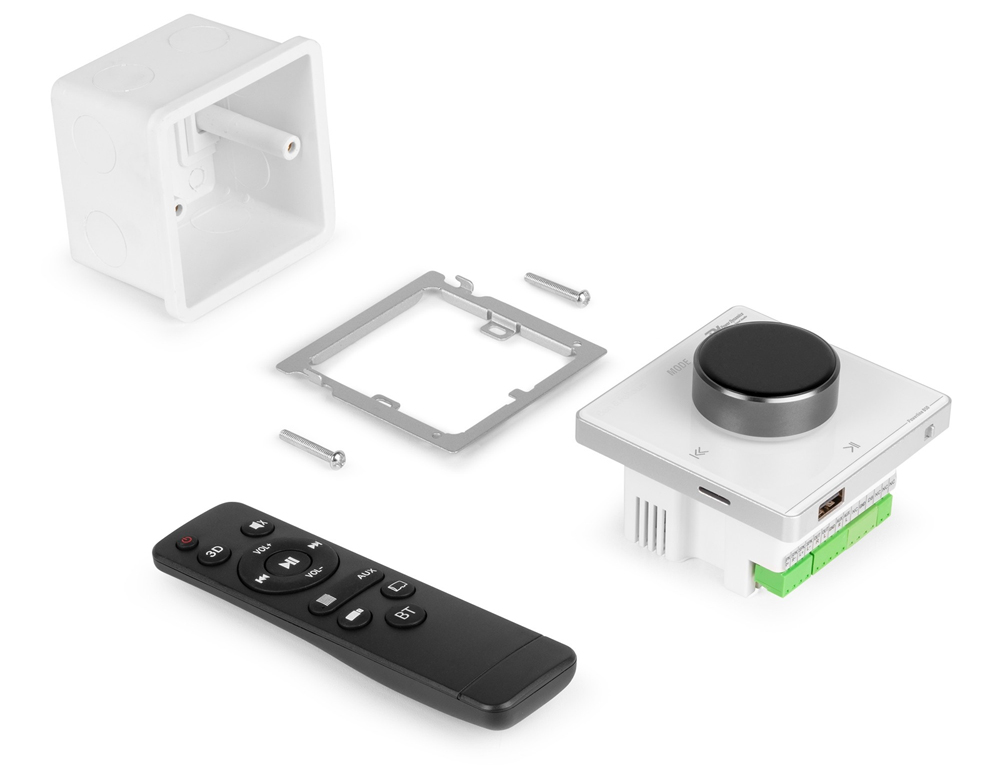 Μοντέρνος, εντοιχιζόμενος compact ενισχυτής της Power Dynamics, με κομψό φινίρισμα, οθόνη αφής και μινιμαλιστική εμφάνιση, για τοποθέτηση σε τοίχους, έπιπλα ή διάφορες κατασκευές. Απολαύστε την αγαπημένη σας μουσική από πολλές πηγές, όπως BT Streaming, USB, κάρτα microSD και είσοδο AUX. Η λειτουργία BT streaming σας επιτρέπει να συνδέεστε απευθείας με το smartphone, το tablet, τον φορητό υπολογιστή σας κ.λπ. Η οθόνη αφής και η οθόνη LCD 1.28" σας δίνουν τη δυνατότητα να ελέγχετε όλες τις λειτουργίες του συστήματος, απλώς αγγίξτε και ξεκινήστε. Συνοδεύεται και από ασύρματο χειριστήριο πλήρης λειτουργίας.  Διαθέτει ενίσχυση 2x 25W Class-D και είναι ιδανικός για να το συνοδεύσετε με δύο ηχεία (οροφής ή επίτοιχα).