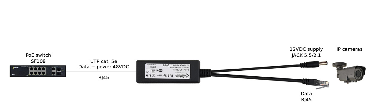 Το SP-POE12 της Pulsar είναι ένα ενεργό PoE Splitter για τον διαχωρισμό δεδομένων (Data) και Τροφοδοσίας 12V, συμβατό με το πρότυπο IEEE 802.3af (Input 48V). Μπορεί να χρησιμοποιείται σε συνδυασμό με ένα PoE Injector 48V (802.3af) ή ένα PoE Switch 48V (802.3af) ώστε να τροφοδοτήσουμε μία IP συσκευή που δεν υποστηρίζει PoE, με τάση 12VDC και Δίκτυο, μέσα από ένα καλώδιο Ethernet.