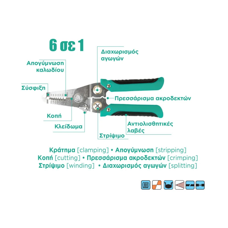 Ο απογυμνωτής/πρέσσα CP-406S της Proskit αποτελεί ένα πρακτικό και αξιόπιστο πολυεργαλείο 6 σε 1, σχεδιασμένο για να καλύπτει τις βασικές ανάγκες κάθε ηλεκτρολογικής εργασίας με ευκολία και ακρίβεια. Συνδυάζει λειτουργίες όπως απογύμνωση, κοπή και πρεσσάρισμα ακροδεκτών (με και χωρίς μόνωση), προσφέροντας ευελιξία και εξοικονόμηση χρόνου σε επαγγελματίες και ερασιτέχνες.