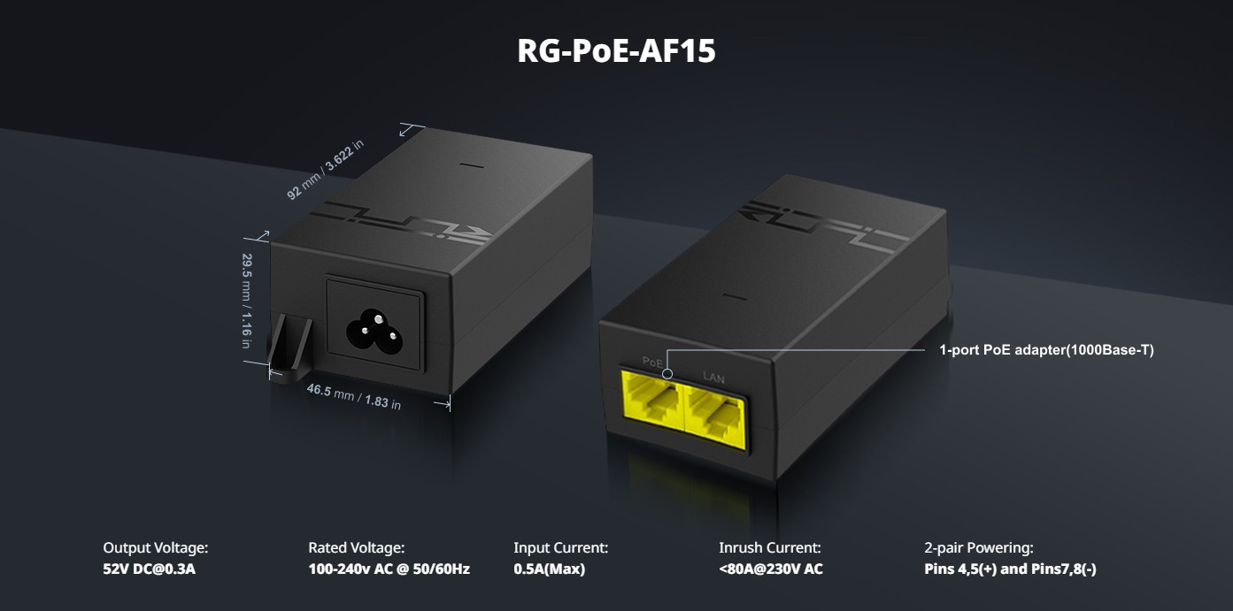 Ruijie RG-POE-AF15 PoE Injector 1000Mbps 52V 15.6W, 6971693274723