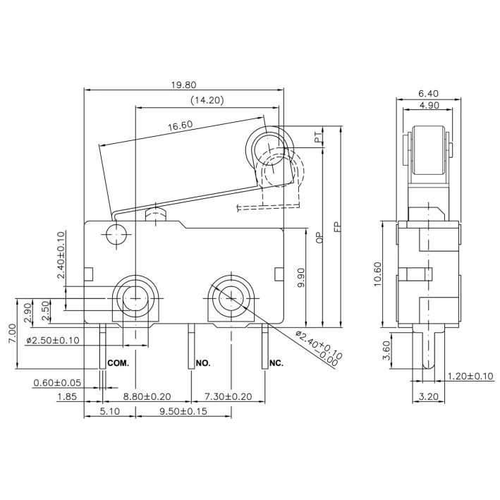 Διακόπτης Microswitch Mini, PCB, με λαμάκι κοντό και ροδάκι 16.6
