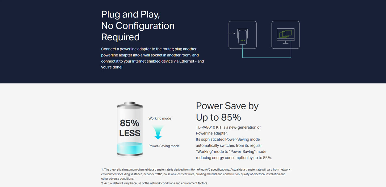 Επιπλέον, η πατενταρισμένη λειτουργία εξοικονόμησης ενέργειας μειώνει αυτόματα την κατανάλωση έως και 85%, καθιστώντας το Powerline Kit μια αποδοτική και οικολογική λύση για το οικιακό σας δίκτυο.