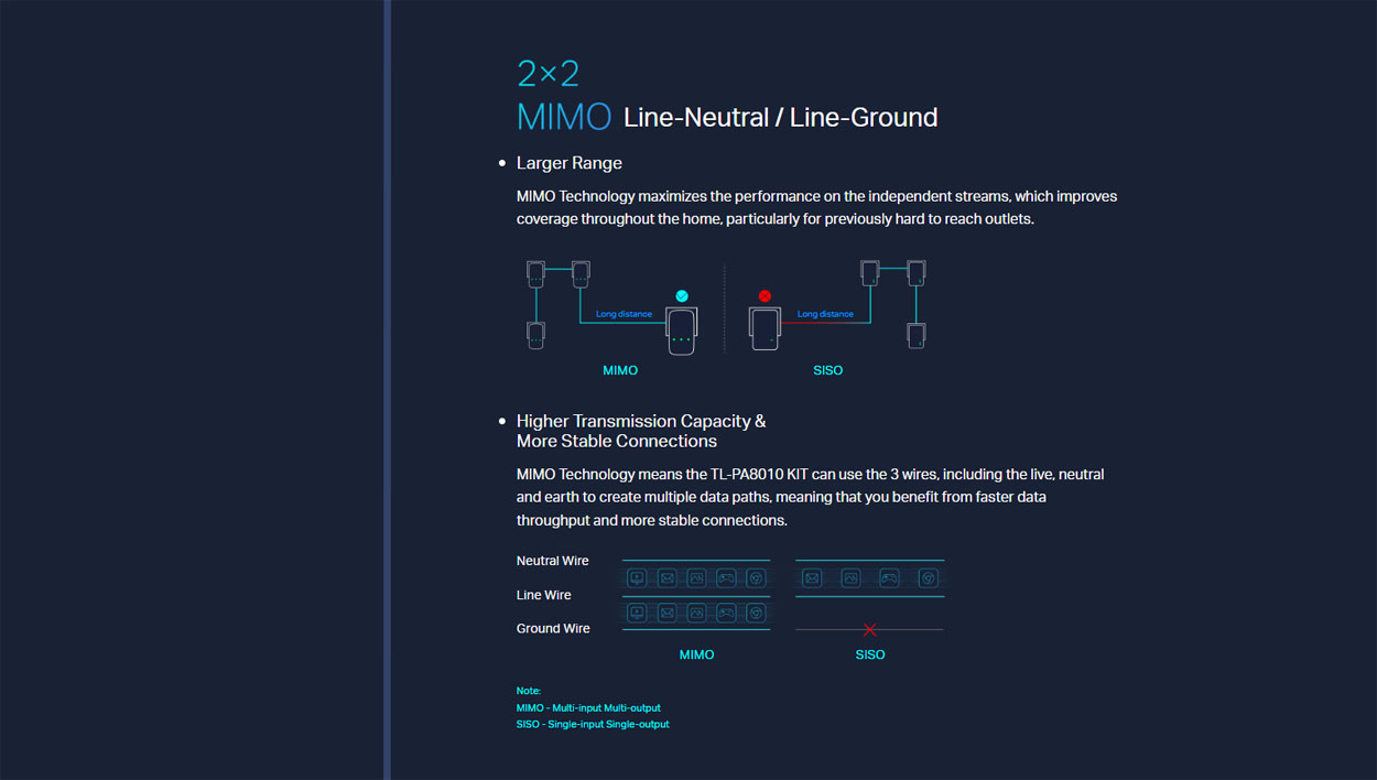 Η προηγμένη τεχνολογία 2×2 MIMO Ουδέτερης Γραμμής/Γείωσης με Beamforming εξασφαλίζει μεγαλύτερη εμβέλεια, αυξημένη χωρητικότητα μετάδοσης και πιο σταθερή σύνδεση, ακόμα και σε χώρους με δύσκολη καλωδίωση.