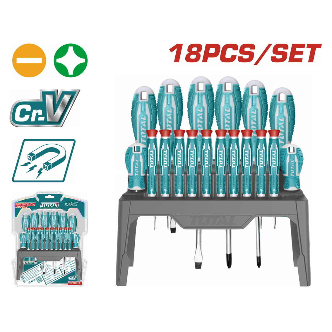 Σετ 18 Κατσαβιδιών της TOTAL, THT250618. Μεγάλης αντοχής, κατασκευασμένα από υψηλής ποιότητας κράμα CR-V (chromium vanadium), με εργονομική λαβή από αντιολισθητικό υλικό και μαγνητική μύτη (εκτός τα ακριβείας).