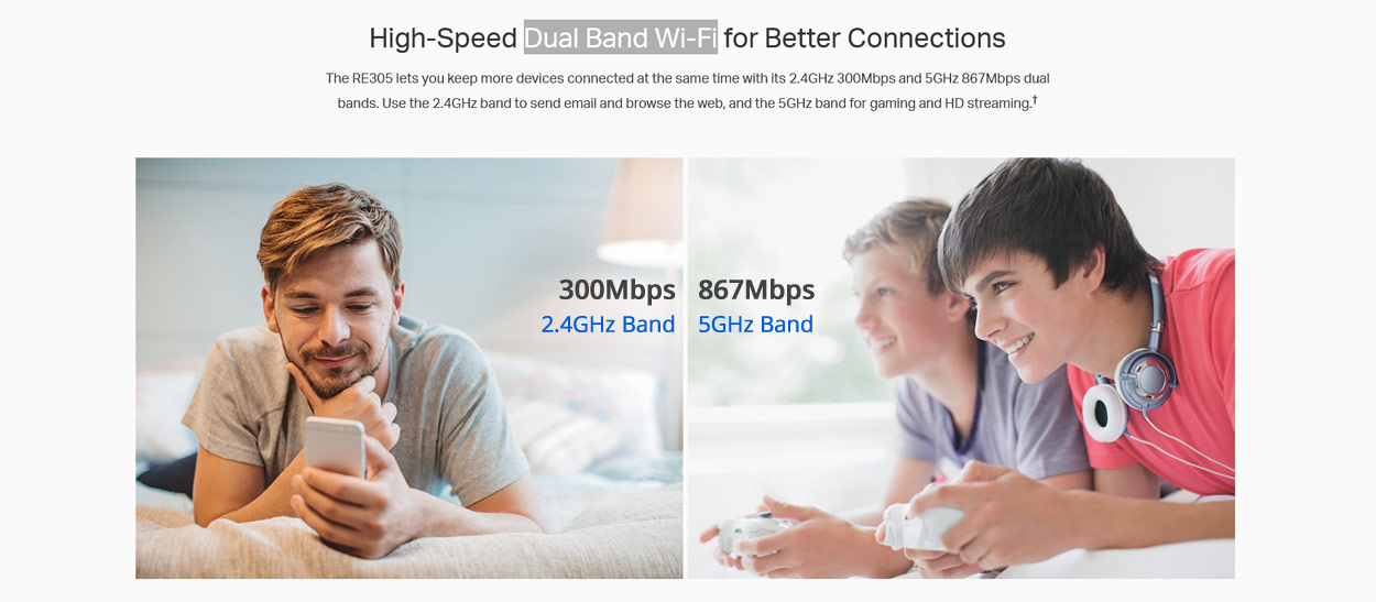 - Ενσωματωμένη Λειτουργία Access Point: Περισσότερο από ένας απλός ενισχυτής, το RE305 μπορεί να μετατρέψει την ενσύρματη σύνδεσή σας σε ασύρματο σημείο πρόσβασης Dual Band απλώς συνδέοντας ένα καλώδιο Ethernet στη θύρα του.