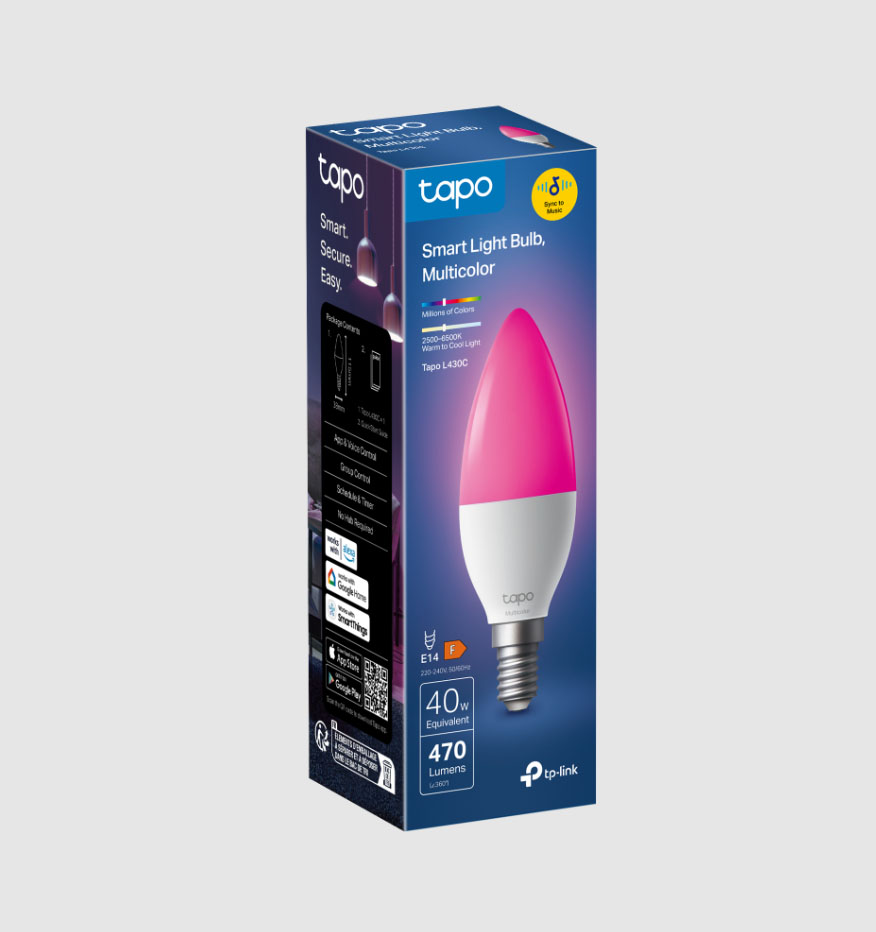 TP-LINK Tapo L430C 4-Pack (V1.0) έξυπνη λάμπα LED Multicolor, σε συσκευασία 4 Pack (4 τεμαχίων), κατάλληλη για βιδωτό ντουί Ε14, με φωτεινότητα 470Lm και κατανάλωση 5W.