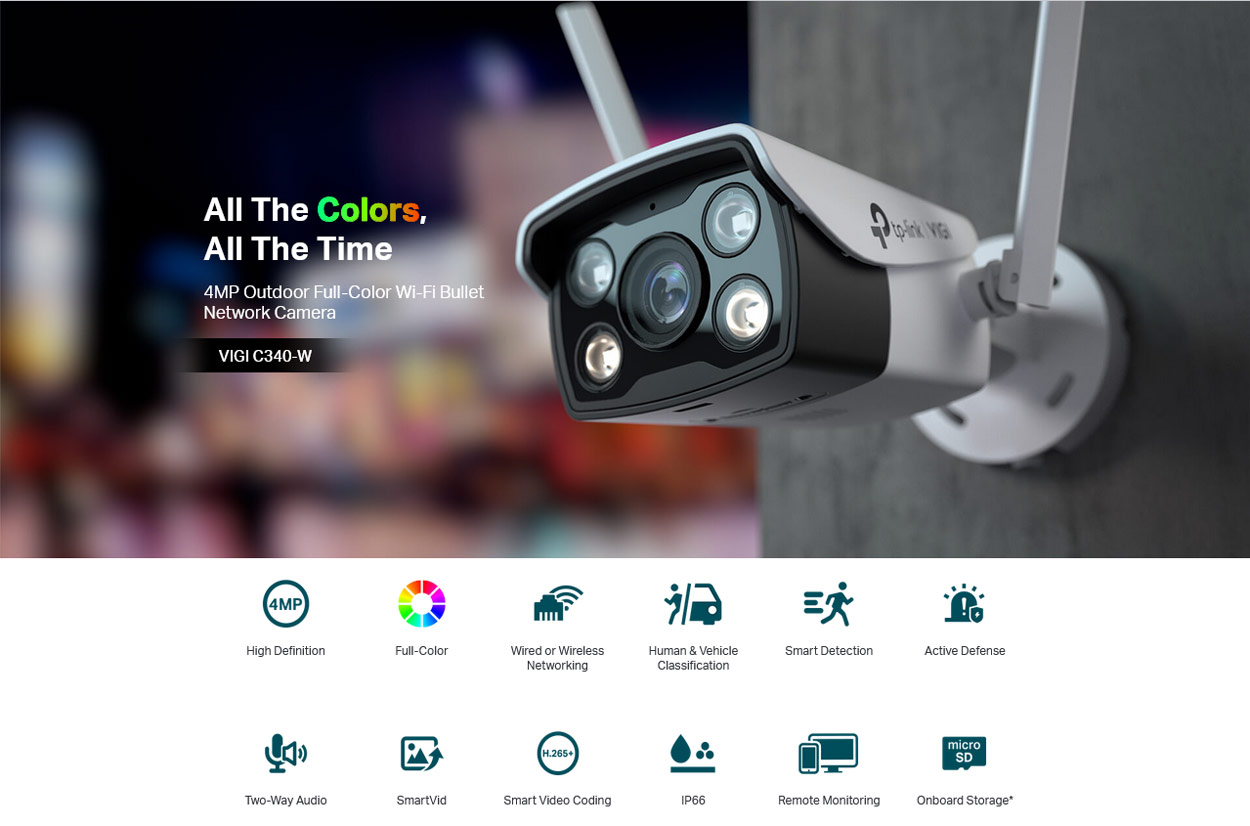 TP-LINK VIGI C340-W - Ασύρματη (Wi-Fi 2.4GHz) και Ενσύρματη (Ethernet) σταθερή δικτυακή IP Κάμερα ασφαλείας της εταιρείας TP-LINK, από την επαγγελματική σειρά προϊόντων VIGI της TP-Link, με υψηλή ανάλυση εικόνας 4MPixels. Διαθέτει αδιάβροχο κέλυφος, με βαθμό προστασίας IP66, ώστε να είναι κατάλληλη για χρήση σε εσωτερικούς και εξωτερικούς χώρους.