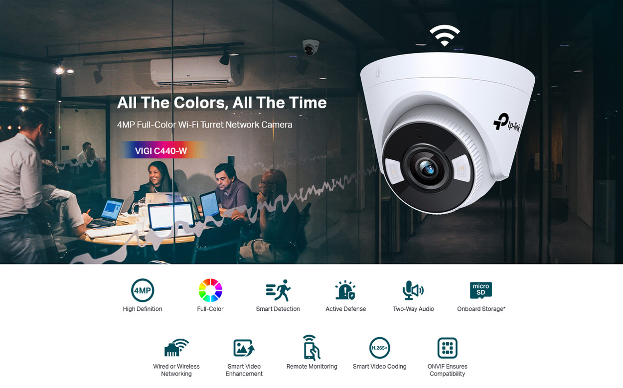 TP-LINK VIGI C440-W - Ασύρματη (Wi-Fi 2.4GHz) και Ενσύρματη (Ethernet) σταθερή δικτυακή IP Κάμερα ασφαλείας της εταιρείας TP-LINK, από την επαγγελματική σειρά προϊόντων VIGI της TP-Link, με υψηλή ανάλυση εικόνας 4MPixels. Διαθέτει πλαστικό κέλυφος και είναι κατάλληλη για τοποθέτηση σε εσωτερικούς χώρους.
