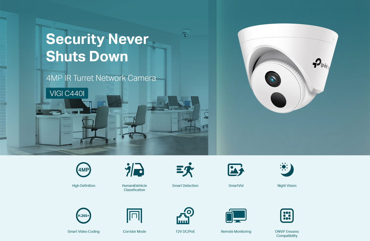 TP-LINK VIGI C440I 2.8mm - Ενσύρματη Δικτυακή IP κάμερα ασφαλείας εσωτερικού χώρου, της εταιρείας TP-LINK, από την επαγγελματική σειρά προϊόντων VIGI της TP-Link, με υψηλή ανάλυση εικόνας 4MPixels. Προσφέρει έως και 30% καλύτερη εικόνα σε σχέση με μία κάμερα ανάλυσης 3MP και είναι κατάλληλη για εγκατάσταση σε επαγγελματικούς αλλά και οικιακούς χώρους, προσφέροντας υψηλή ανάλυση εικόνας, με πολύ καλή αποτύπωση λεπτομερειών σε πρόσωπα αλλά και αντικείμενα. Για την μετάδοση της εικόνας, συνδέεται απευθείας σε ένα δίκτυο IP, όπως το Internet ή ένα τοπικό δίκτυο (LAN), επιτρέποντας τον απομακρυσμένο έλεγχο του χώρου εγκατάστασης, μέσω υπολογιστή ή άλλης συσκευής (smartphone ή tablet), που έχει πρόσβαση στο ίδιο δίκτυο.