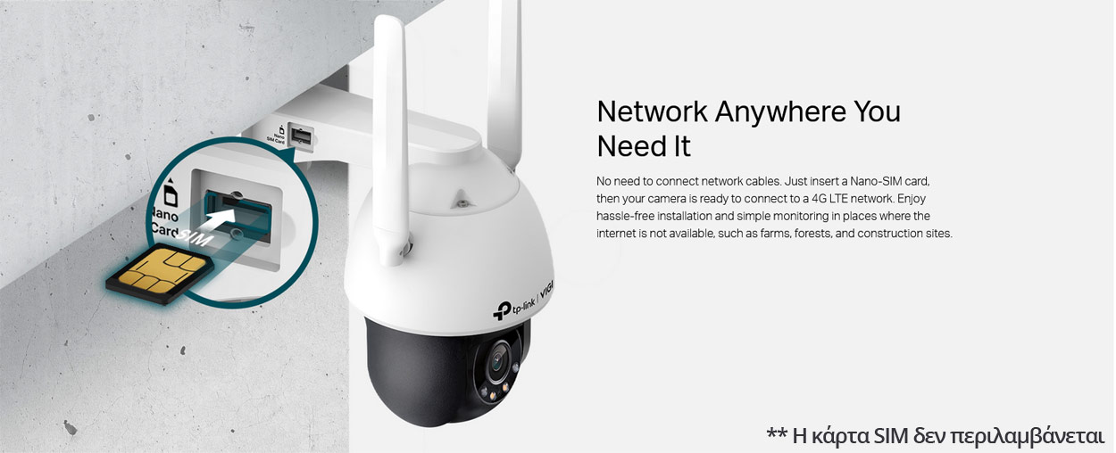 Η VIGI C540-4G της TP-Link είναι η απόλυτη λύση επαγγελματικής επιτήρησης για τοποθεσίες όπου το παραδοσιακό internet είναι ανύπαρκτο ή δύσκολο στην εγκατάσταση. Αυτή η πανίσχυρη κάμερα συνδυάζει κρυστάλλινη εικόνα ανάλυσης 4MPixels με συνεχή έγχρωμη εικόνα καθ' όλο το 24ωρο και πλήρη έλεγχο περιστροφής Pan-Tilt, όλα αυτά με ενσωματωμένη σύνδεση 4G LTE. Διαθέτει υποδοχή για κάρτα SIM (Nano SIM - Η κάρτα SIM δεν περιλαμβάνεται) και υποστηρίζει σύνδεση μέσω δικτύου κινητής τηλεφωνίας 4G. Σημειώστε πως υποστηρίζει επίσης και ενσύρματη σύνδεση LAN μέσω θύρας Ethernet.