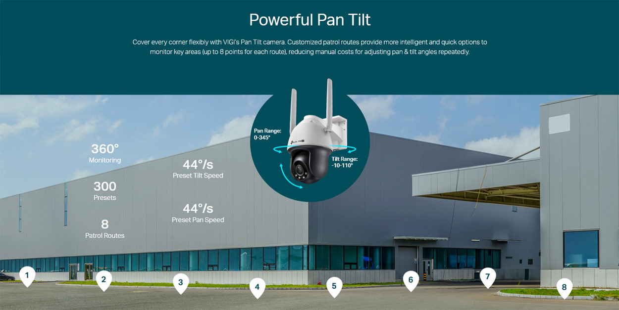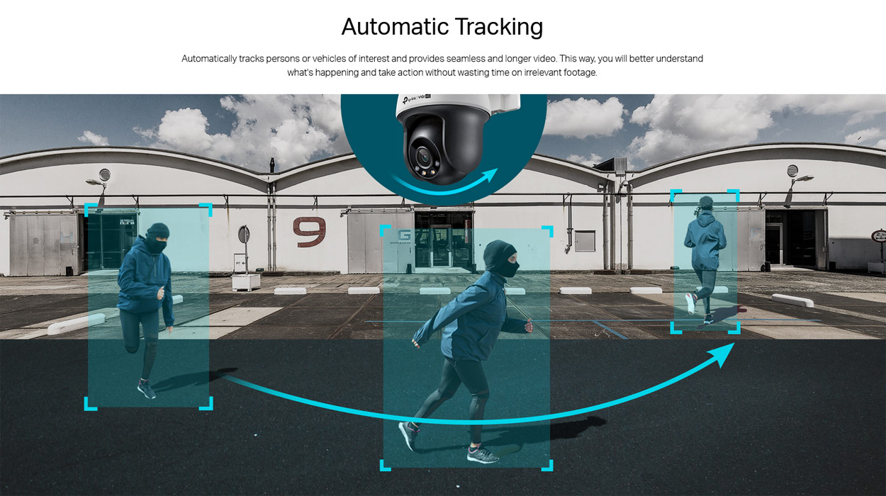 Η ασύρματη IP Κάμερα VIGI C540V υποστηρίζει επίσης "Αυτόματη Παρακολούθηση & Περιπολία", ώστε να μπορείτε να προγραμματίστε έως και 8 διαδρομές περιπολίας αλλά και να χρησιμοποιήστε την λειτουργία Auto Tracking (Αυτόματη Παρακολούθηση Στόχου) για να ακολουθήσει έξυπνα κινούμενα πρόσωπα ή οχήματα.