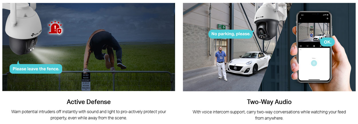 Υποστηρίζει τεχνολογία Active Defense, ώστε να μπορείτε να προειδοποιήσετε άμεσα πιθανούς εισβολείς με ήχο (σειρήνα) και φως όταν ανιχνεύονται μη φυσιολογικά συμβάντα. Διαθέτει επίσης ενσωματωμένο μικρόφωνο και μεγάφωνο και υποστηρίζει Αμφίδρομο Ήχο (Two-Way Audio), επιτρέποντάς σας να μιλάτε και να ακούτε από οπουδήποτε παρακολουθείτε την κάμερας σας.