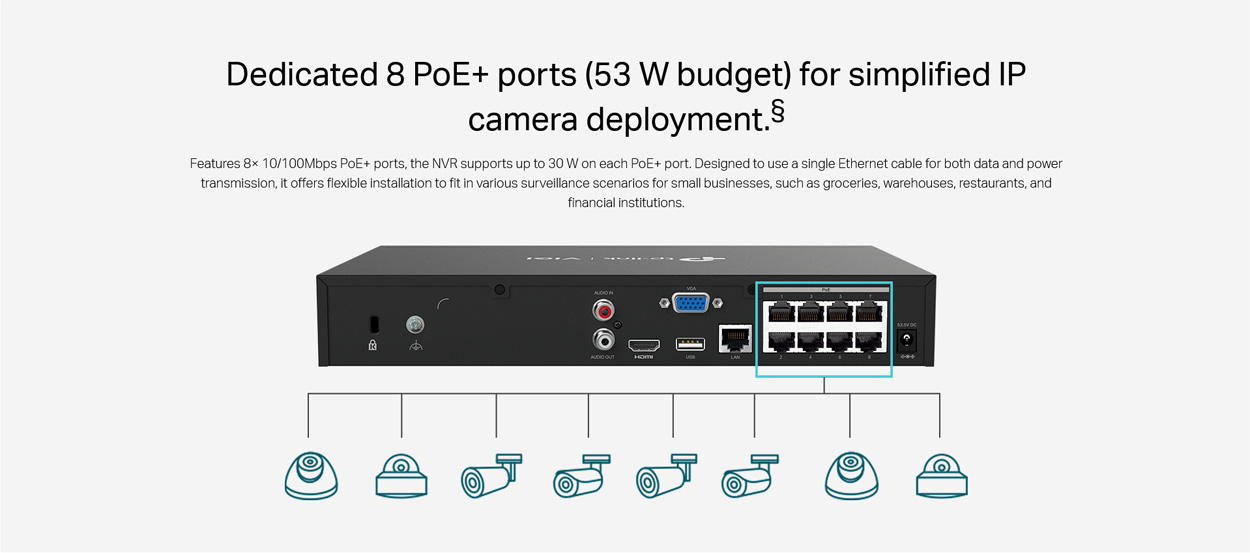 TP-LINK VIGI NVR1008H-8P v1.20 - Δικτυακό Καταγραφικό NVR 8 καμερών. Διαθέτει ενσωματωμένο Ethernet Switch 8 καμερών, μέγιστης συνολικής ισχύος 53Watts, το οποίο παρέχει τροφοδοσία PoE (Power Over Ethernet) σε 8 κάμερες, χωρίς την ανάγκη επιπλέον τροφοδοτικού για τις κάμερες.