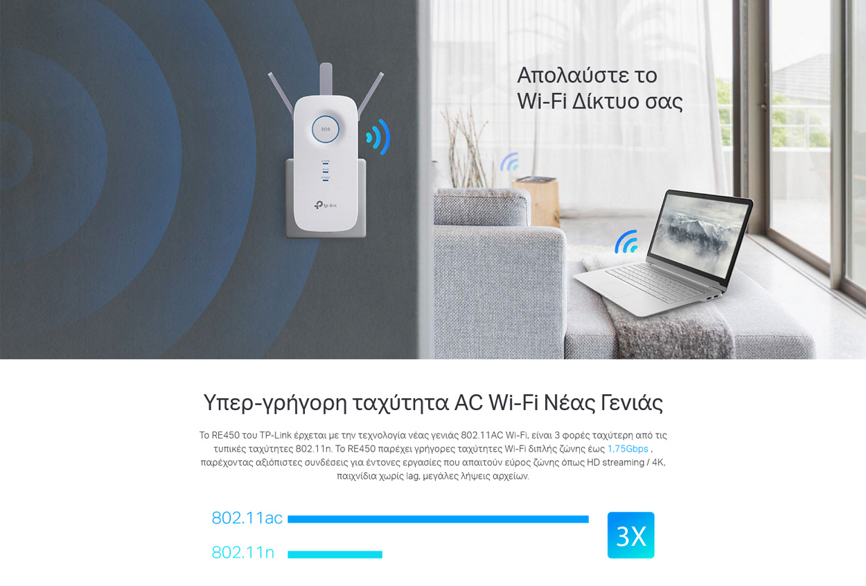 Το TP-Link RE450 είναι σχεδιασμένο για να προσφέρει απόλυτη απόδοση στο οικιακό σας δίκτυο, ενισχύοντας το σήμα του δρομολογητή σας σε περιοχές που προηγουμένως δεν υπήρχε κάλυψη. Χάρη στην τεχνολογία 802.11AC, είναι έως και 3 φορές ταχύτερο από τις τυπικές συσκευές προηγούμενης γενιάς.