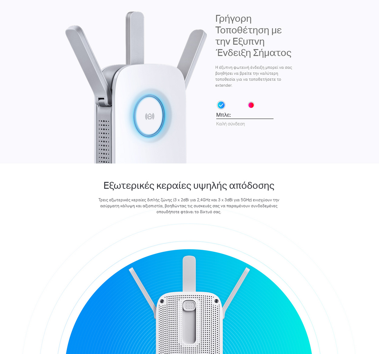 - Έξυπνη Ένδειξη Σήματος: Η φωτεινή ένδειξη σάς βοηθά να εντοπίσετε το ιδανικό σημείο τοποθέτησης. Το μπλε χρώμα υποδεικνύει καλή σύνδεση, ενώ το κόκκινο σημαίνει ότι η συσκευή βρίσκεται πολύ μακριά από τον δρομολογητή.