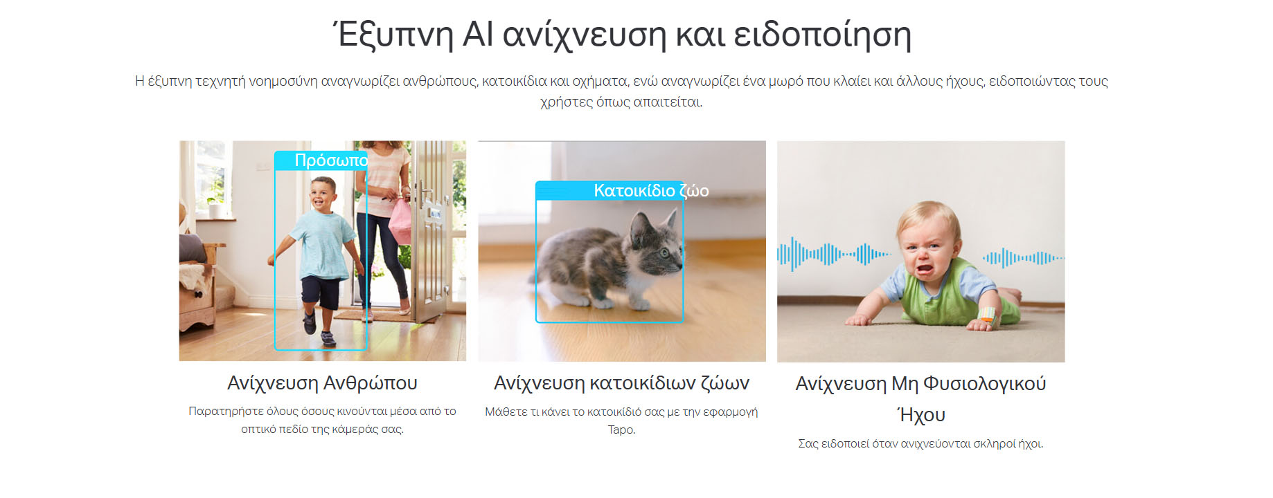 Υποστηρίζει συμπίεση Video H.264 για ταχύτερη μετάδοση στο δίκτυο και μεγαλύτερους χρόνους καταγραφής. Διαθέτει ενσωματωμένο μικρόφωνο και μεγάφωνο, προσφέροντας αμφίδρομη ηχητική επικοινωνία. Η κάμερα διαθέτει AI detection που υποστηρίζει ανίχνευση κίνησης, ανίχνευση ατόμου, ανίχνευση διάβασης γραμμής, ανίχνευση παραβίασης, ανίχνευση κλάματος μωρού, ανίχνευση οχήματος, ανίχνευση κατοικίδιου, ανίχνευση σπασμού γυαλιού. Ακριβής παρακολούθηση κίνησης με έξυπνη παρακολούθηση κίνησης και ταχύτητα περιστροφής έως 120°/s που παρακολουθεί και ακολουθεί το θέμα για να το διατηρεί εντός του οπτικού σας πεδίου και να παρακολουθείτε τη δράση με άμεση αποστολή push notification στην εφαρμογή και δυνατότητα ενεργοποίησης strobe light και αναπαραγωγής customized ηχητικών μηνυμάτων σε συναγερμό, υποστήριξη Alexa και Google Assistant,
