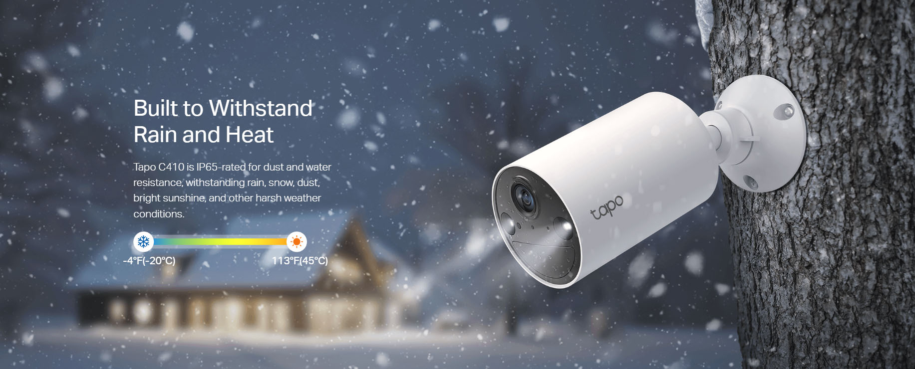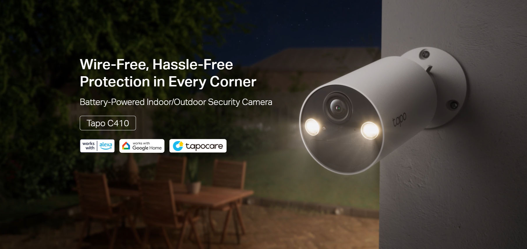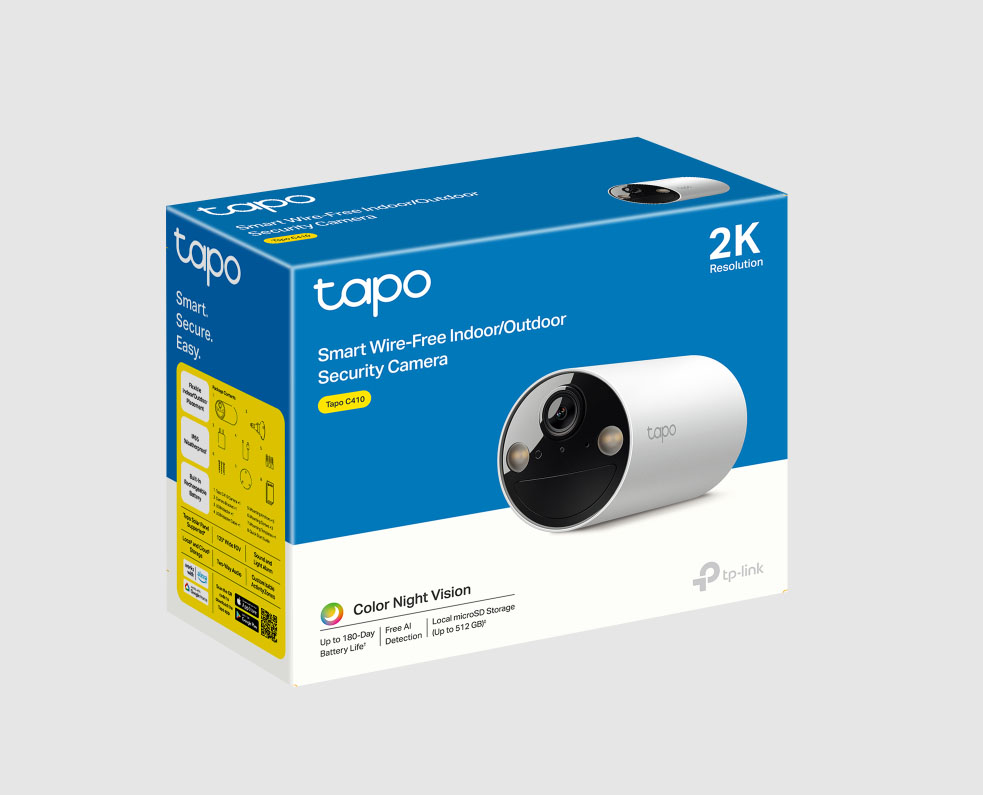 Η Tapo C410 είναι μια έξυπνη κάμερα ασφαλείας εξωτερικού χώρου, πλήρως ασύρματη και αυτόνομη, η οποία υποστηρίζει σύνδεση μέσω Wi‑Fi 2,4 GHz και λειτουργεί με την ενσωματωμένη επαναφορτιζόμενη μπαταρία 6400 mAh, η οποία μπορεί να προσφέρει διάρκεια έως 180 ημέρες με μία μόνο φόρτιση (υπό συνθήκες). Είναι κατάλληλη για χρήση σε εξωτερικούς χώρους, με βαθμό στεγανότητας IP65. Διαθέτει αισθητήρα εικόνας 1/2.8” ανάλυσης 3MPixels (2K) 2304 × 1296 pixels @ 15fps και σταθερό ευρυγώνιο φακό 3.17mm με μεγάλη γωνία οριζόντιας θέασης 111°.
