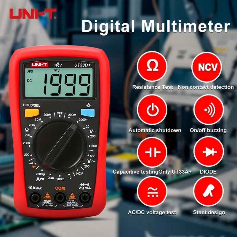 Ψηφιακό πολύμετρο Τσέπης NCV και οθόνη LCD της UNI-TREND, UT-33D+. Με μέτρηση τάσης AC/DC, ωμικής αντίστασης Ω, μέτρηση ωμικής συνέχειας με buzzer, με ένδειξη χαμηλής μπαταρίας και δυνατότητα συγκράτηση απεικόνισης (HOLD). Η νέα γενιά σειράς UT33+ επαναπροσδιορίζει τα πρότυπα απόδοσης για ψηφιακά πολύμετρα εισαγωγικού επιπέδου.