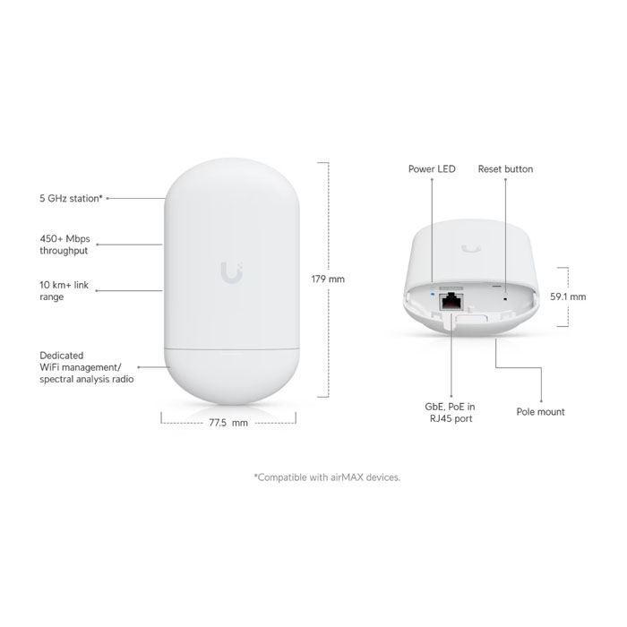 Παρά το μικροσκοπικό του μέγεθος, το Loco5AC διαθέτει θύρα GigabitEthernet για να μην περιορίζεται η ταχύτητα της ασύρματης ζεύξης από το ενσύρματο δίκτυο. Είναι κατασκευασμένο από ανθεκτικό πλαστικό UV-stabilized για συνεχή εξωτερική χρήση.