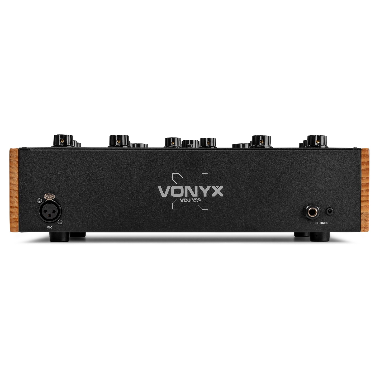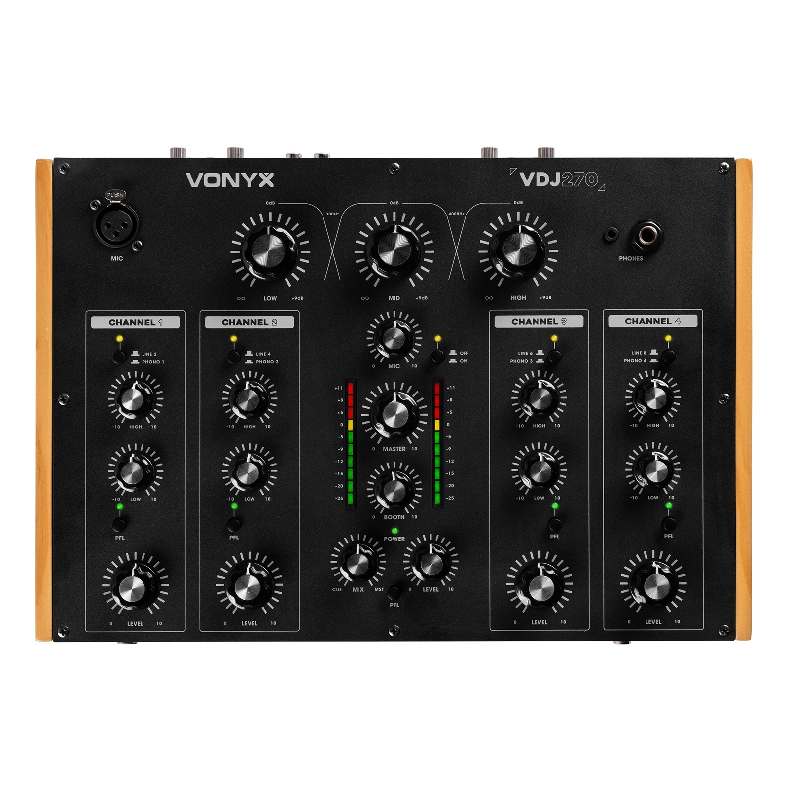 DJ μίκτης της Vonyx VDJ270 που επαναφέρει την οικεία αίσθηση των κλασικών ρυθμίσεων DJ. Αντί για μοντέρνα faders, εργάζεστε με περιστροφικά κουμπιά που εξασφαλίζουν μια ομαλή και φυσική εμπειρία μίξης. Ιδανικός για τους λάτρεις του βινυλίου και τα κλασικά σετ DJ, αλλά και για τον σύγχρονο DJ με ψηφιακά music players ή CD Players. Χάρη στα τέσσερα ξεχωριστά κανάλια, μπορείτε εύκολα να συνδέσετε έως και τέσσερα διαφορετικά πικάπ ή άλλες πηγές ήχου. Ο μαύρος σχεδιασμός με ξύλινα πλαϊνά δίνει στον αναλογικό μίκτη μια πιο Vintage νότα και εμφάνιση που ταιριάζει απόλυτα με βινύλιο και κλασικά DJ σετ.
