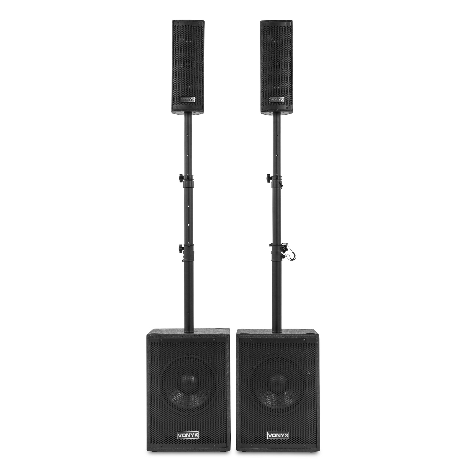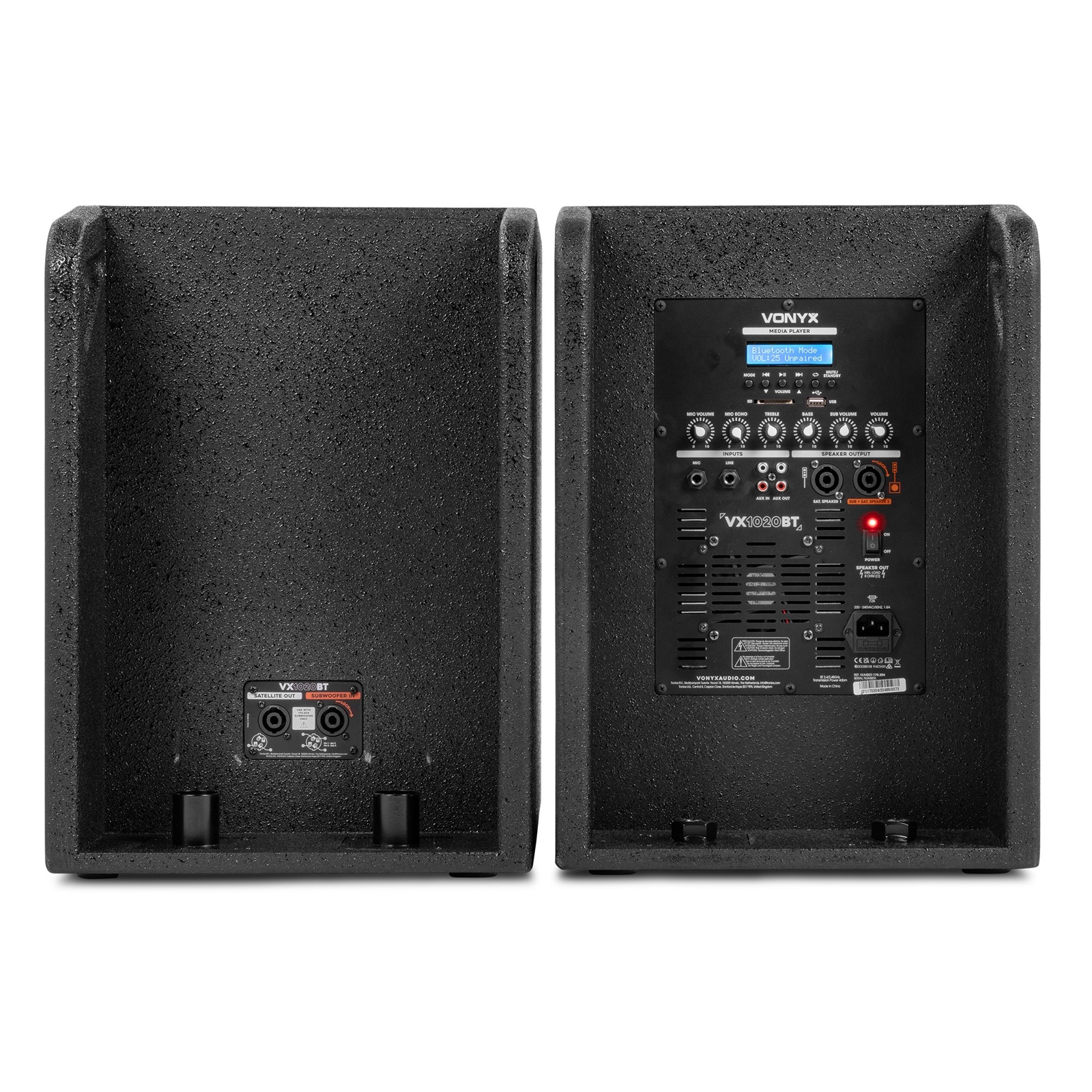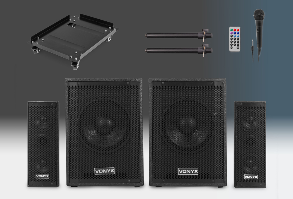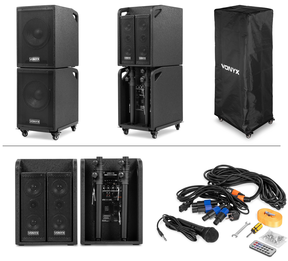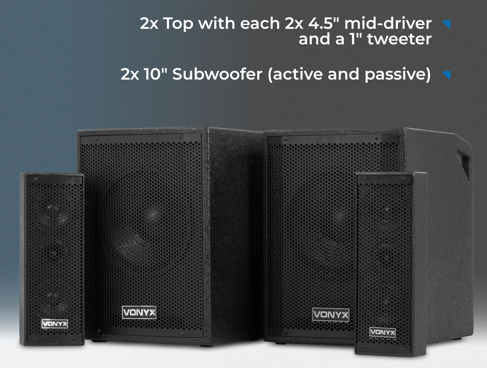 Αυτοενισχυόμενο Σετ με 2x Top Speaker παθητικά με ανθεκτική PRO καμπίνα και 2x Subwoofer 10" (1x παθητικό + 1x ενεργό) 170.204. Το σετ της Vonyx είναι πλήρες και περιλαμβάνει 2 βάσεις στήριξης των Top Speaker πάνω στα Subwoofers, καλώδια σύνδεσης των ηχείων, ενσύρματο μικρόφωνο και ασύρματο τηλεχειριστήριο. Σε όλα αυτά προστίθενται και οι λειτουργίες αναπαραγωγής MP3 τραγουδιών μέσω USB και κάρτας SD, όπως και ο δέκτης Bluetooth για streaming μουσικής ασύρματα από το Smartphone, Tablet, Laptop, κλπ. Πλήρες και compact σύστημα, plug and play, έτοιμο για χρήση. Ένα πολύ δυνατό ηχητικό πακέτο, ιδανικό για χρήση σε αυτούς που θέλουν εύκολα να μεταφέρουν το ηχητικό τους σύστημα άμεσα και ξεκούραστα. Εξαιρετική απόδοση και ποιότητα σε σχέση με τη τιμή του !