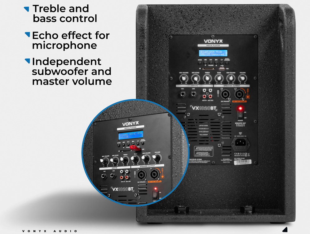 Το ενεργό sub woofer ενσωματώνει επίσης και όλες τις ρυθμίσεις και λειτουργίες. Στο πίσω του μέρος θα βρείτε το panel διαχείρισης των MP3 τραγουδιών και του Bluetooth, όπως και το μεγάλο ευανάγνωστο LCD Display. Μπορεί να δεχθεί από εξωτερικές πηγές Aux IN, Line IN και Mic IN. Επιπλέον υπάρχει και Line out έξοδος. Από ρυθμιστικά διαθέτει Equalizer 2 Band (Bass, Treble), Gain και Echo μικροφώνου και Sub και Master Volume. Προς τα κάτω υπάρχουν 2 έξοδοι (Speakon Out).