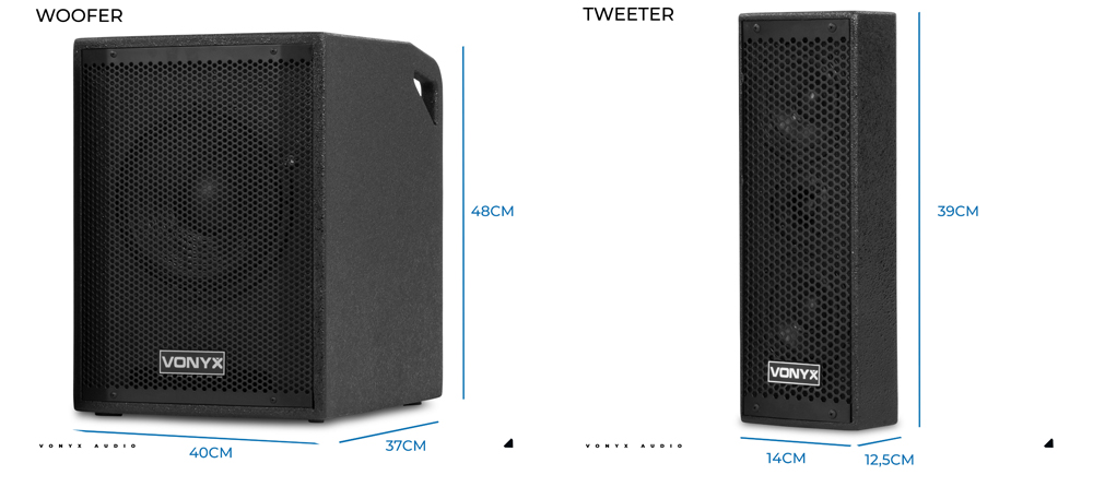 2 x Παθητικά ηχεία Top Speaker ισχύος 110 Watt Power, με ανθεκτική καμπίνα σειράς PRO που το κάθε ένα περιλαμβάνει 2x Mid 4.5" και Tweeter 1". Διαθέτουν υποδοχή στο κάτω μέρος για να μπουν στη βάση που τα συνοδεύει. Διαστάσεις κάθε ηχείου 125 x 140 x 390mm.