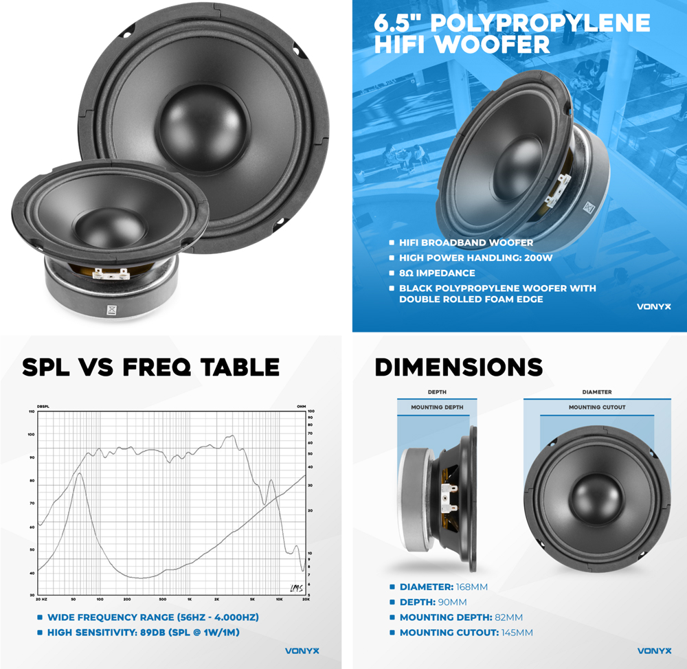 WP16 Hi Fi Woofer - Mid 6.5"(16cm) με σκληρό polypropylene cone και εξαιρετική ποιότητα ήχου. Μπορεί να λειτουργήσει είτε σαν woofer είτε σαν midrange με ισχύς 200 Watt Max / 100 Watt RMS. Διαθέτει μεγάλο και βαρύ μαγνήτη με σύστημα εξαερισμού, ικανό να παράγει δυνατό και καθαρό μπάσο σε χαμηλές και μεσαίες συχνότητες. Impedance 8 Ohm. Frequency response: 56Hz - 6kHz. SPL @ 1W/1m: 89dB.